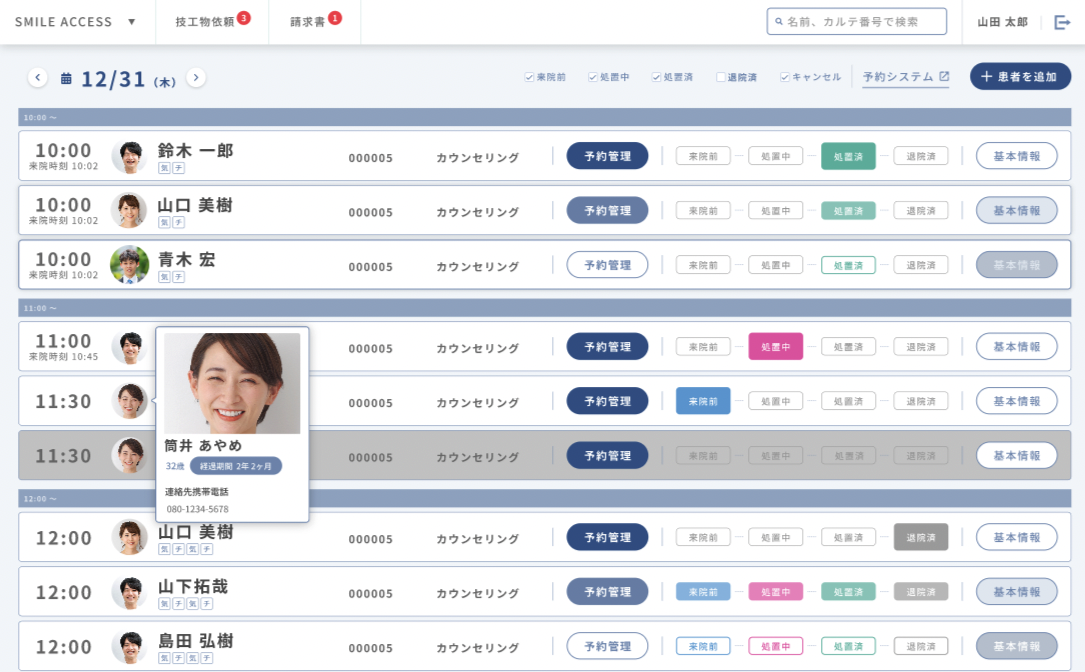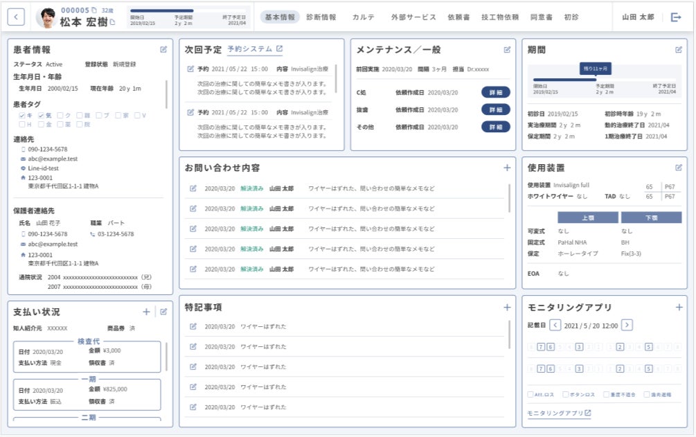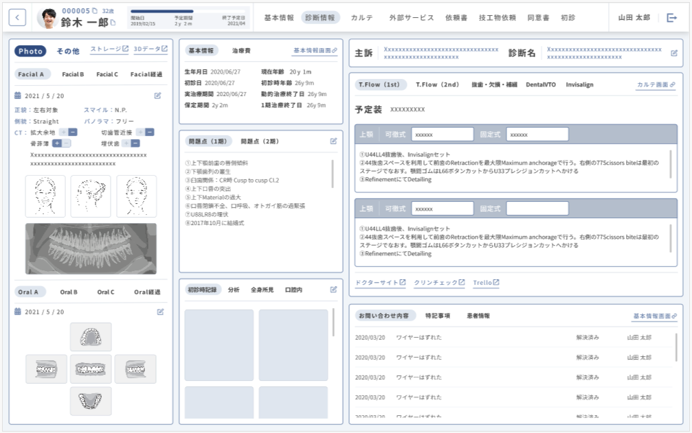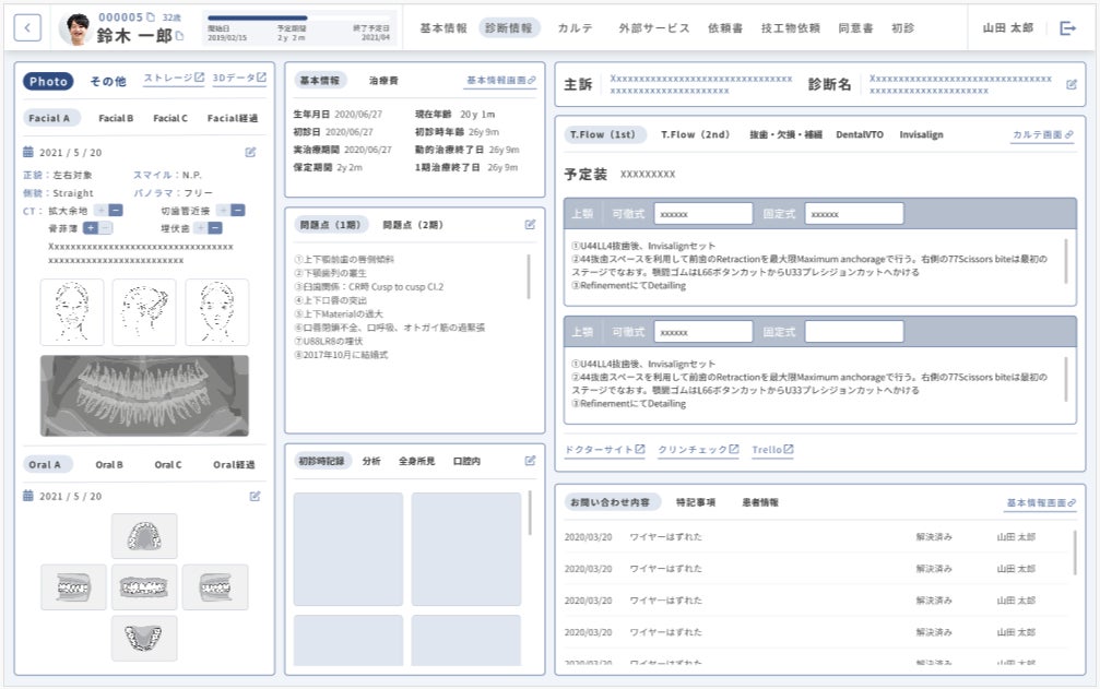 - 日々のカルテ入力から、紹介状や同意書の管理、技工物の発注管理まで、散在する患者のデータを集約するハブとなるプラットフォームです。