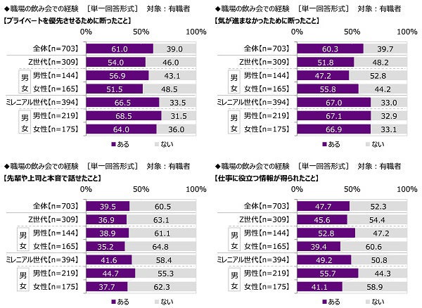 経験率(「ある」と回答した人の割合)をみると、【プライベートを優先させるために断ったこと】では61.0%、【気が進まなかったために断ったこと】では60.3%、【先輩や上司と本音で話せたこと】では39.5%、【仕事に役立つ情報が得られたこと】では47.7%となりました。