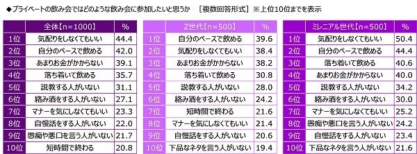 - 若者世代が参加したい飲み会 1位「気配りをしなくてもいい」2位「自分のペースで飲める」3位「あまりお金がかからない」4位「落ち着いて飲める」