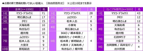 - お酒の席で愚痴を聞いてほしい芸能人 「マツコ・デラックスさん」がダントツ Z世代2位「ムロツヨシさん」3位「松本人志さん」、ミレニアル世代2位「タモリさん」「明石家さんまさん」