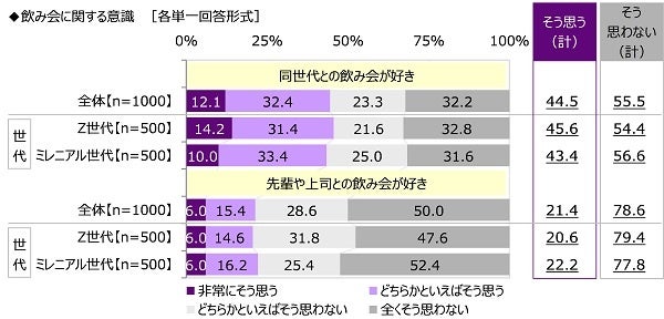 - 若者世代の飲み会に関する意識 「同世代との飲み会が好き」45%