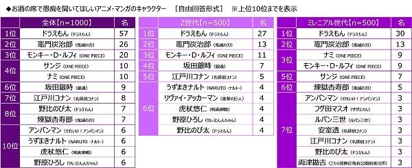 また、お酒の席で愚痴を聞いてほしいアニメ・マンガのキャラクターを聞いたところ、「ドラえもん(ドラえもん)」がダントツ、2位「竈門炭治郎(鬼滅の刃)」、3位「モンキー・D・ルフィ(ONE PIECE)」、4位「サンジ(ONE PIECE)」「ナミ(ONE PIECE)」と続きました。