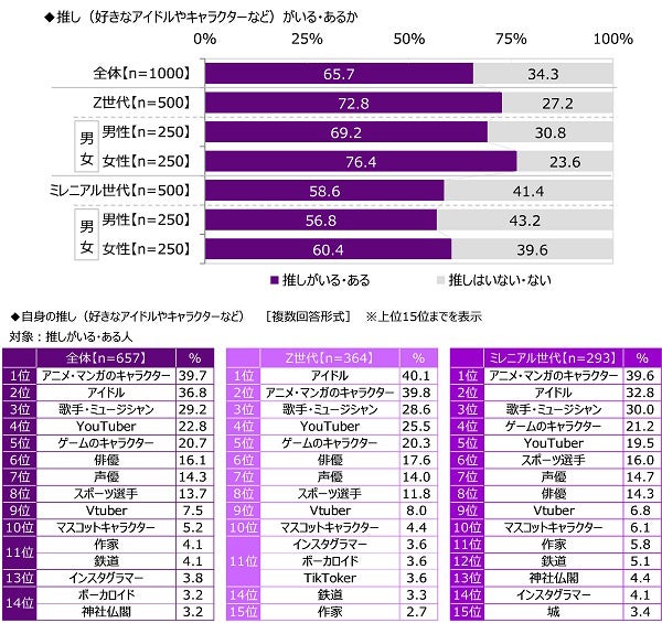 - 若者世代にとっては“推し”がいることは当たり前! 若者世代の66%が「推しがいる」と回答 若者世代の“推し”TOP5は「アニメ・マンガキャラ」「アイドル」「歌手・ミュージシャン」「YouTuber」「ゲームキャラ」 Z世代1位は「アイドル」、ミレニアル世代1位は「アニメ・マンガキャラ」