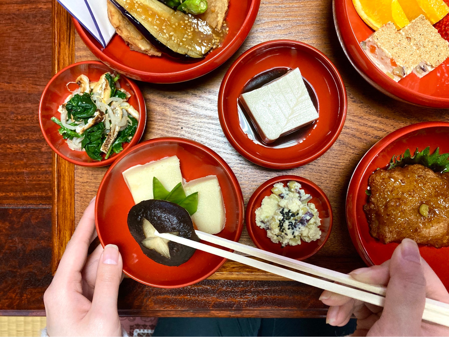 総本山永平寺で修業を積んだ副住職が腕によりをかけて作る精進料理は、目にも美しく、味も絶品です。副住職とお話をしながら、心がととのう時間を過ごしましょう。