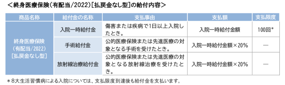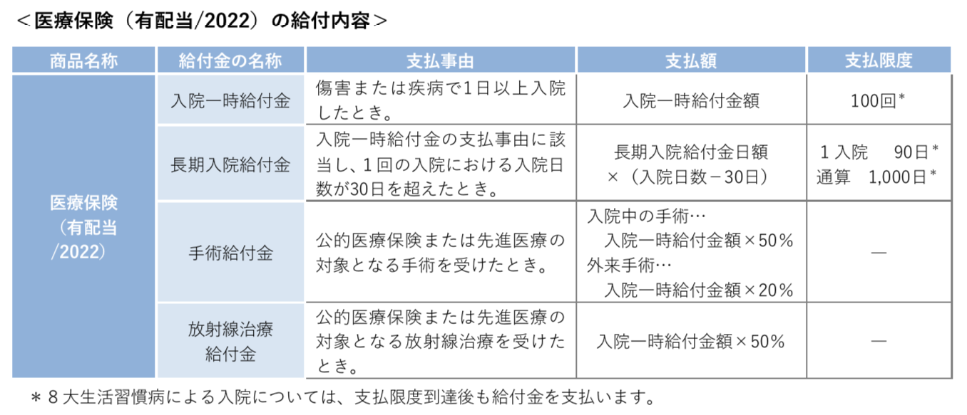 「ワイド・プロテクト」の発売にあわせて、終身医療保険についても全面改定を実施し、高齢層をメインターゲットとする「終身医療保険(一時金タイプ)」(終身医療保険(有配当/2022)[払戻金なし型])として新たに発売します。