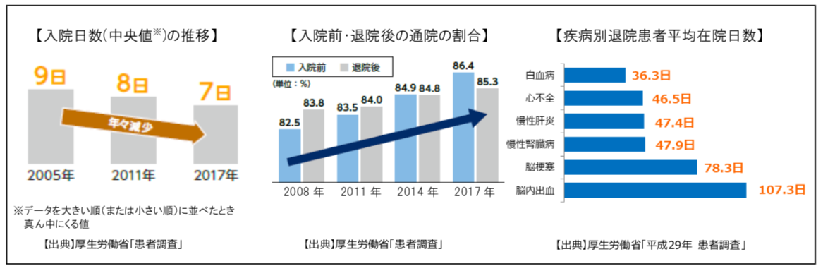 ・ 医療技術の進歩等の影響によって入院の短期化が進む一方、入院前後の通院の割合は年々増加しています。そのため、短期間の入院であっても、通院治療費のほか、入院時の食費や交通費等の諸費用が加わることで、相当額の自己負担を要する可能性があります。入院日数に左右されにくいこれらの費用は、一時金方式による定額の入院給付でカバーするのがより合理的といえます。
