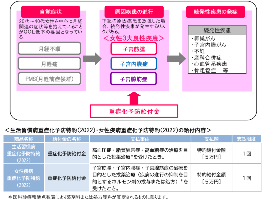 高血圧症・脂質異常症・高血糖症の投薬治療を保障する「生活習慣病重症化予防特約(2022)」と、子宮筋腫・子宮内膜症・子宮腺筋症の投薬治療を保障する「女性疾病重症化予防特約(2022)」を新設します。