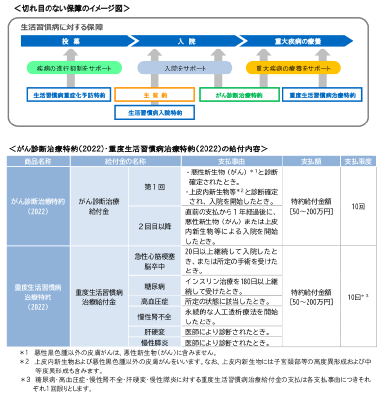 「ワイド・プロテクト」では、従来の医療保険における3大疾病(がん・急性心筋梗塞・脳卒中)の重点保障についてもリニューアルを行い、がんの診断確定等に対して一時金(最高200万円)を支払う「がん診断治療特約(2022)」と、7つの重度生活習慣病(急性心筋梗塞・脳卒中・糖尿病・高血圧症・慢性腎不全・肝硬変・慢性膵炎)に対して一時金(最高200万円)を支払う「重度生活習慣病治療特約(2022)」を新設します。