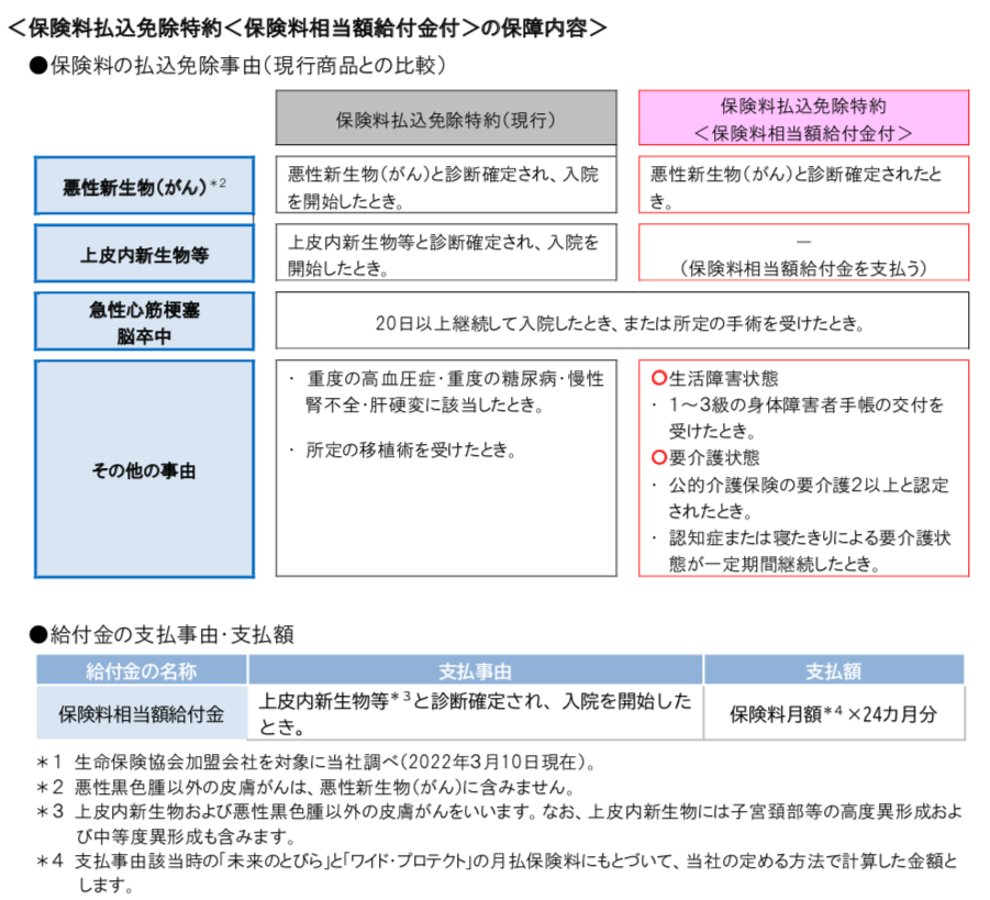 ・ 3大疾病以外の保険料の払込免除事由を「未来のとびら」の生活障害保険金・介護保険金の支払事由と一致させることで、保障内容のわかりやすさ向上を図ります。
