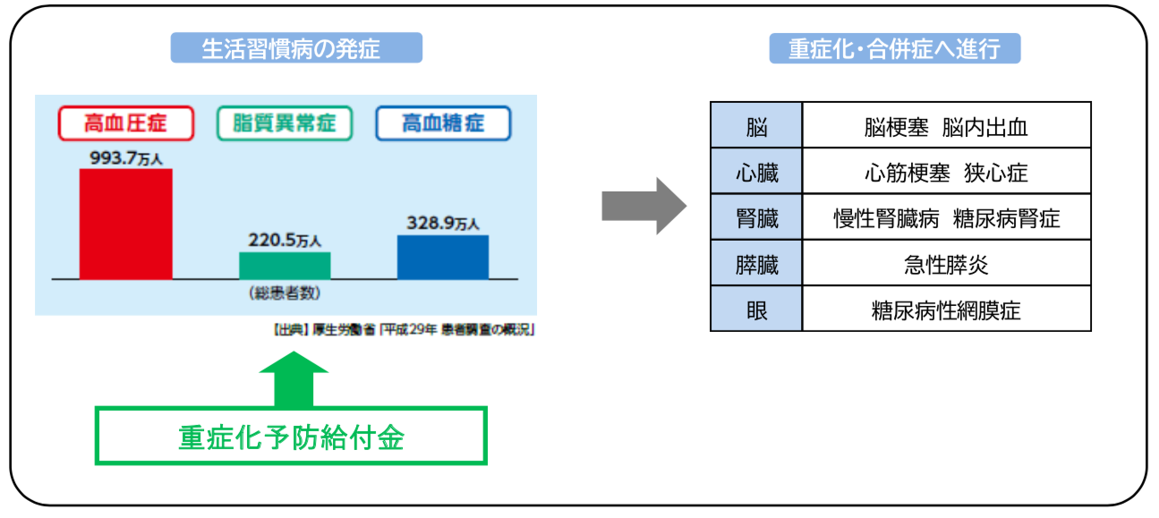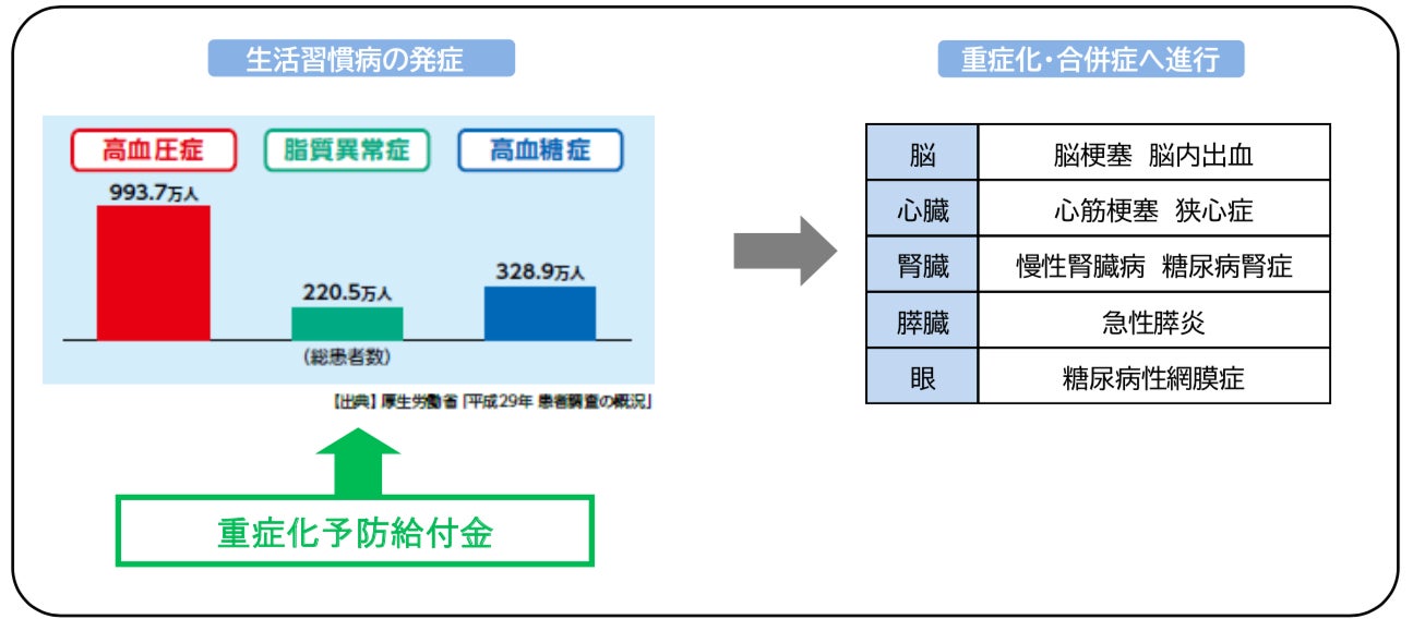・ 「生活習慣病重症化予防特約(2022)」は、高血圧症・脂質異常症・高血糖症で所定の投薬治療を受けた場合に重症化予防給付金をお支払いします。これにより、早期治療のきっかけを提供するとともに、生活習慣の改善などに役立てていただくことで疾病の進行抑制をサポートすることを主眼とします。