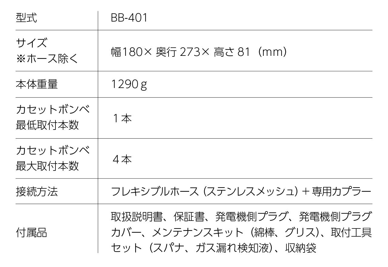 「BB-401」は発電機「クレマ」の発電時間を延ばすことを目的として開発した専用ボンベユニットです。
