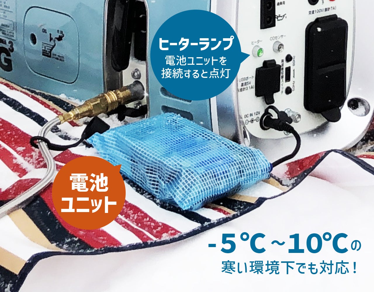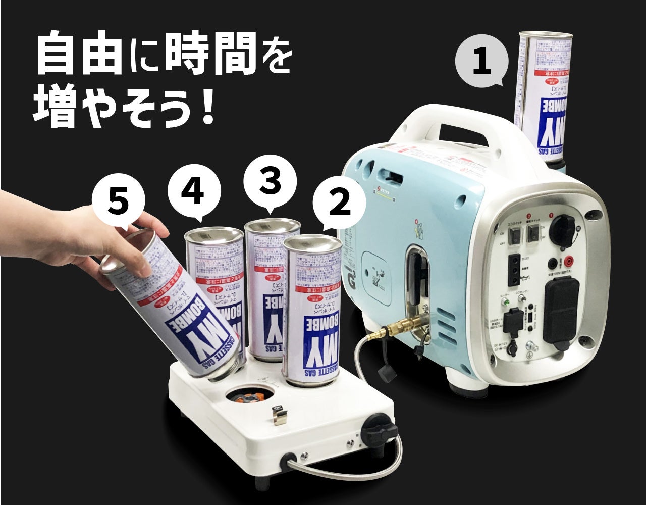 カセットボンベの本数を変えれば運転時間の調整が可能。用途に合わせた使い方ができます。