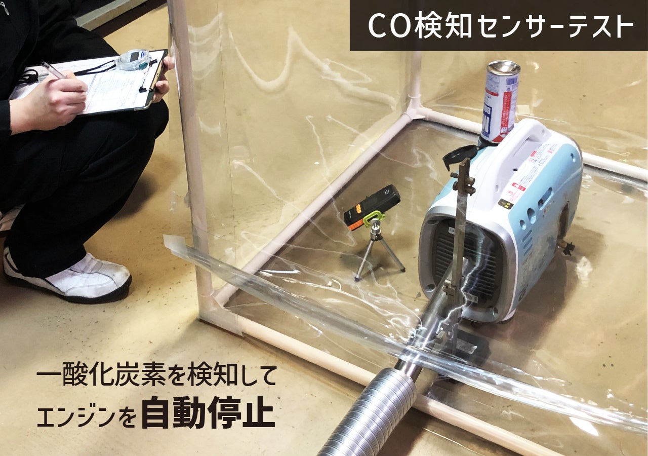 「クレマ」は業界で初めてCOモジュールを標準装備した発電機です。エンジンから排出される排気ガスには多くの一酸化炭素が含まれており過剰に吸入すると危険です。「クレマ」はCOモジュールの働きにより、危険な濃度に達した時はエンジンを強制的に停止します。また始動直後から常に監視しているため、平均濃度が高くても強制停止することで事故を未然に防ぎます。