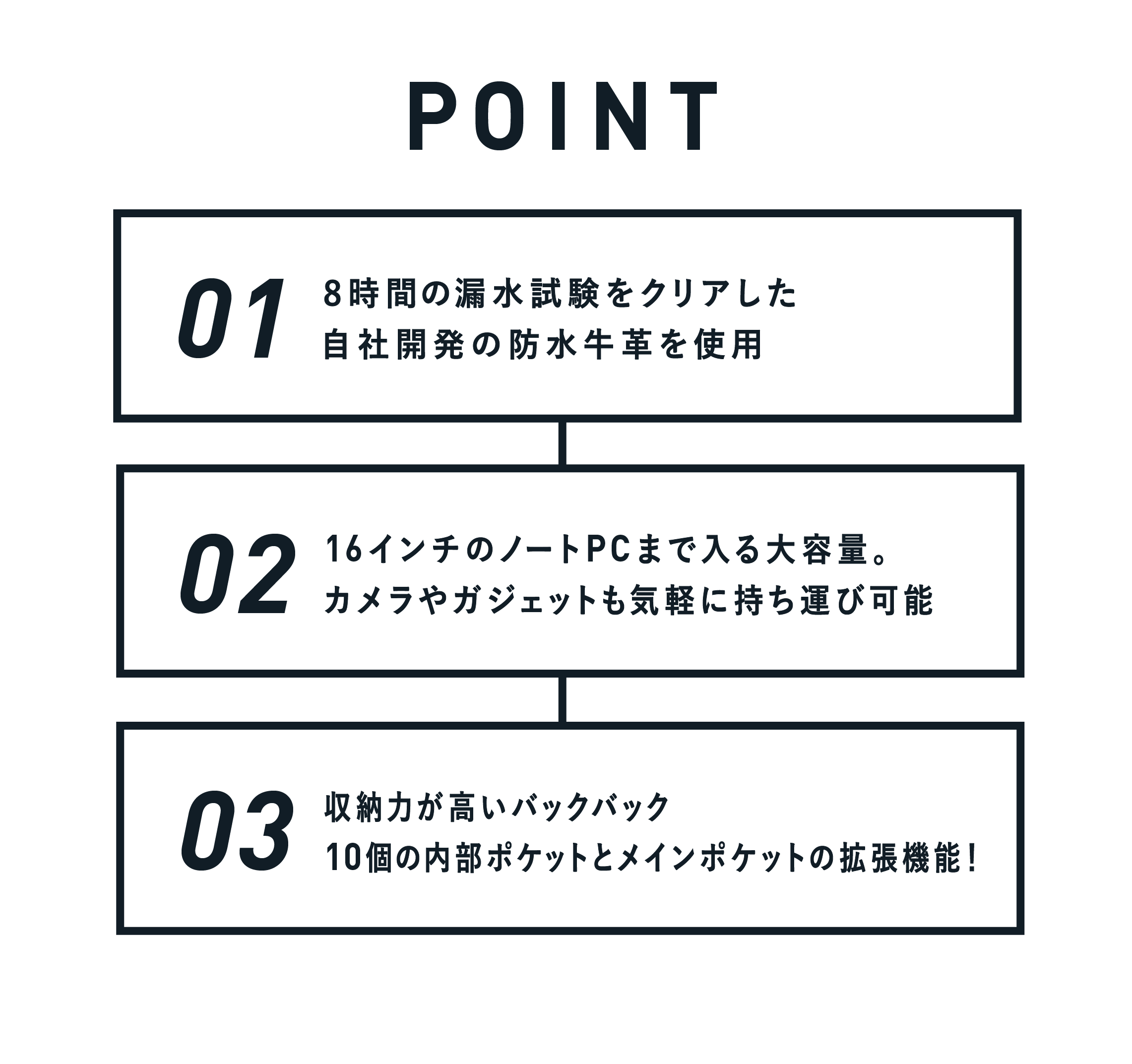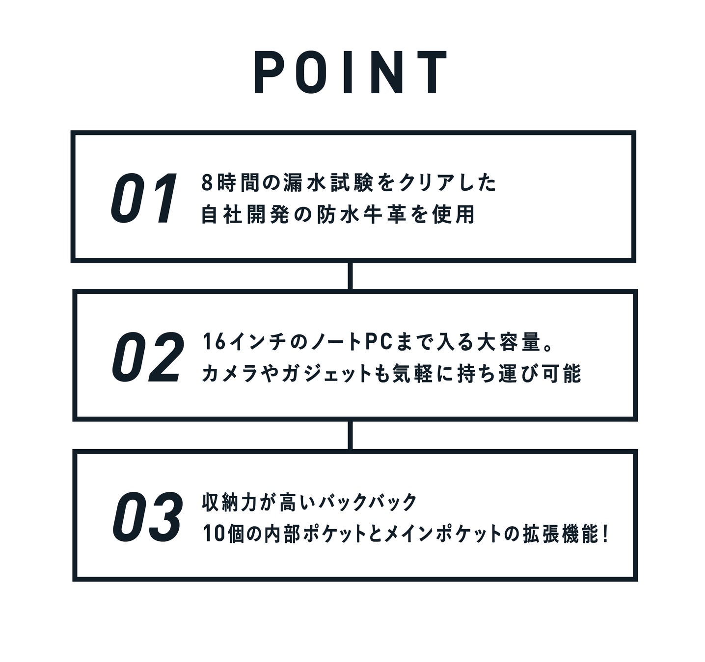 03. 収納力が高いバックパック。 10個の内部ポケットとメインポケットの拡張機能!