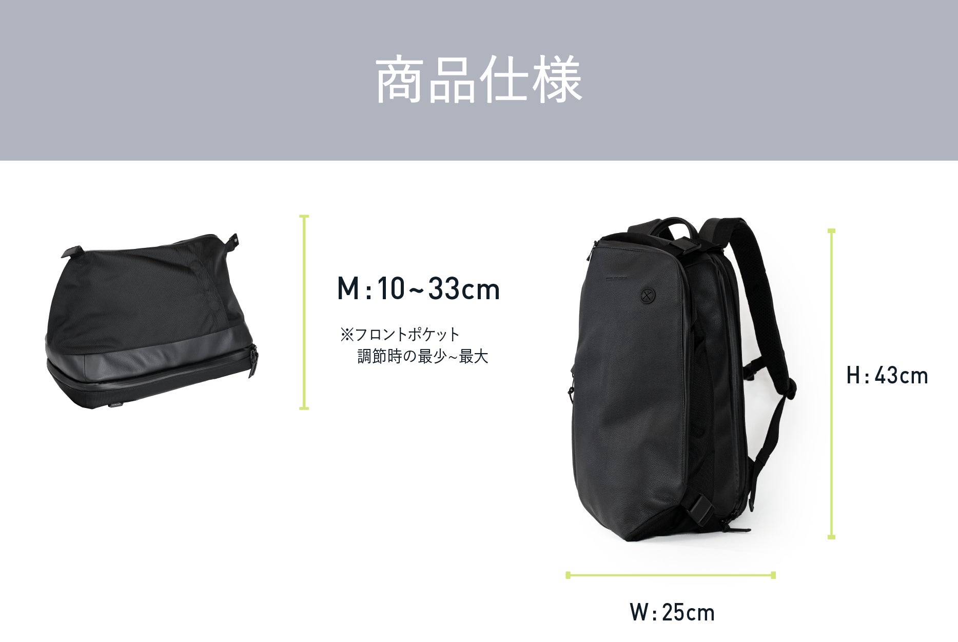 | 25cm | 43cm | 10~33cm | 11~35ℓ | 1300g | 牛革/ナイロン |