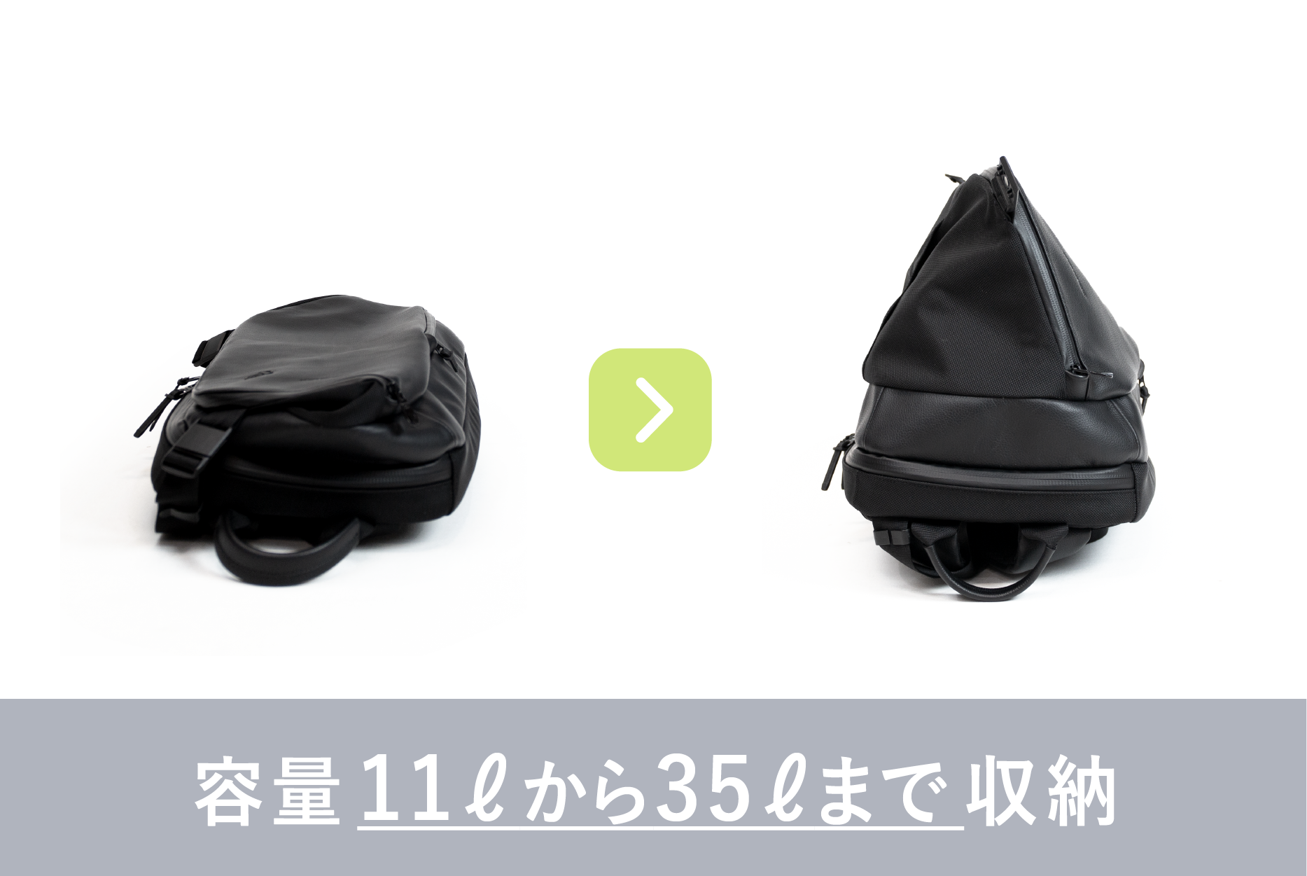 - メインポケットは拡張可能。11ℓ〜35ℓまで広がるから、荷物が増える出張や旅行でも大活躍