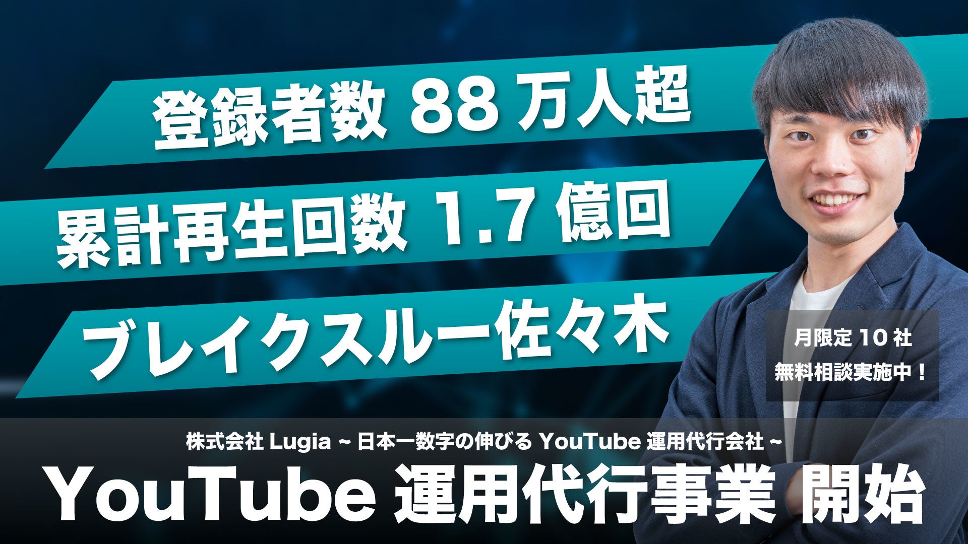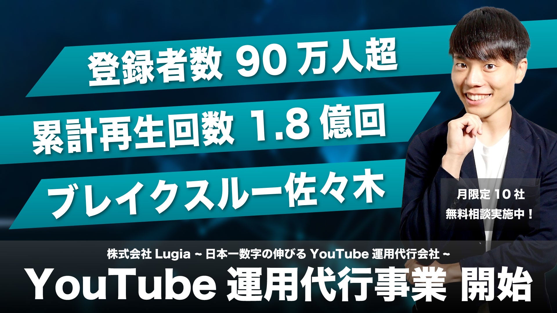 このような背景から、Lugiaでは代表である佐々木自身が自社YouTubeチャンネル『ブレイクスルー佐々木』を現在までに登録者数90万人、累計再生回数1.8億回まで伸ばしたノウハウをもとにYouTube運用代行事業をスタートしました。