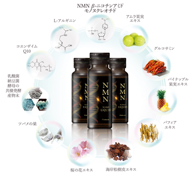 エリスリトール(アメリカ製造)、NMNナノ複合物(β-ニコチンアミドモノヌクレオチド、デキストリン)、乳酸菌・納豆菌・酵母菌の共棲発酵産物末、コエンザイムQ10、酵素処理燕窩末、N-アセチルグルコサミン(えび・かにを含む)、パフィア抽出液、海岸松樹皮エキス末、アムラ果実エキス末、桜の花エキス末、パイナップル果実抽出物(大豆を含む)/L-アルギニン、酸味料、環状オリゴ糖、糖転移ヘスペリジン、ニコチン酸アミド、香料、ビタミンB₂、ビタミンB₆、甘味料(スクラロース、アセスルファムカリウム)、ビタミンB₁₂