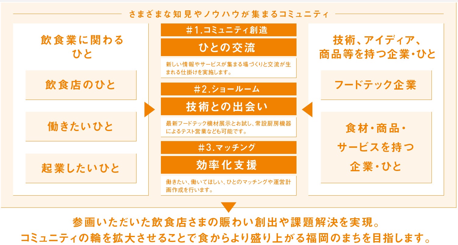 この3つの⽅向性から「福岡を”⾷”で盛り上げる」をキーワードに、福岡の⾷や観光・物流や⽣活インフラなどの分野で活躍する地元企業や個⼈がひとつのコミュニティを形成して、新しい⾷のプラットホームを作りました。