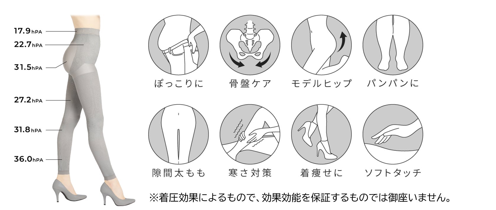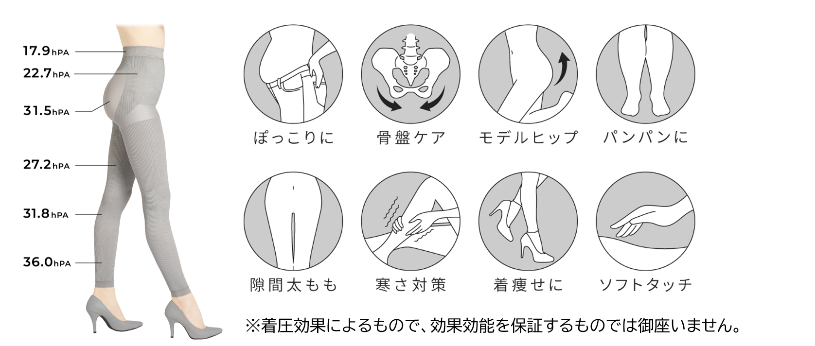 下半身太りのポイントとなる骨盤ケア、段階的な着圧設計による引き締めにより、女性の下半身を細く美しく見せる着圧機能があります。 また、長時間使用しても苦しくないトリートメント仕上げで、給水速乾、UVカット、抗菌防臭など、使いやすさを追求した加工が施されております。