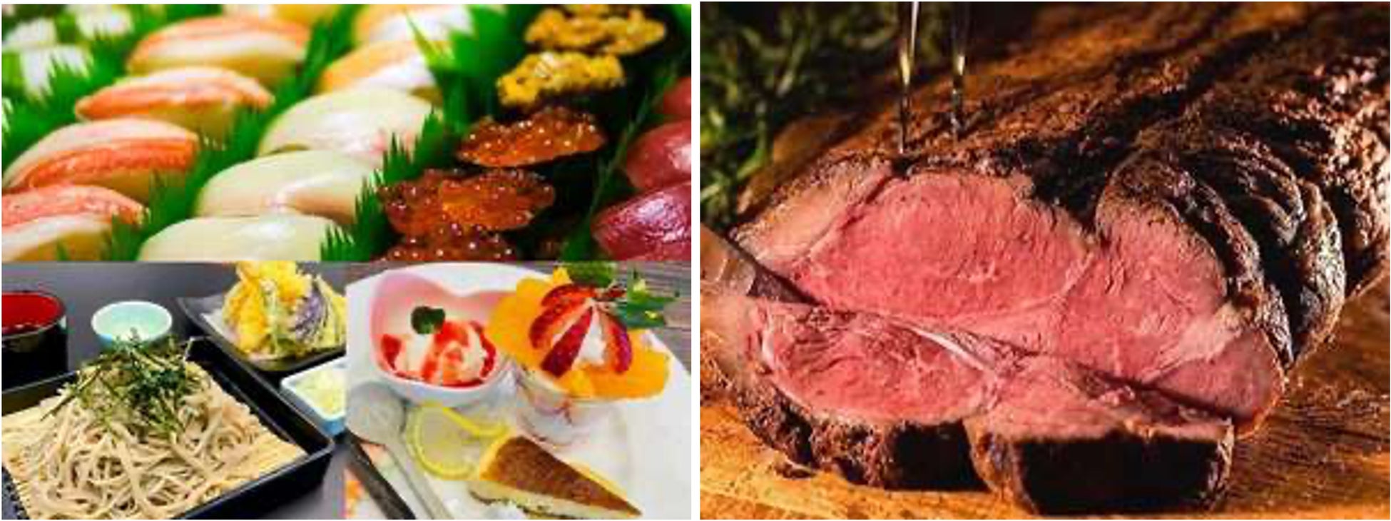 メイン料理は栃木和牛のローストビーフ(サラダボウル付)。さらにシェフが目の前でライブ調理するお料理(寿司・蕎麦・天ぷら・デザート)がバイキング形式で食べ放題!職人が腕によりをかけた出来立てのお料理をお楽しみください。ドリンクバー付。