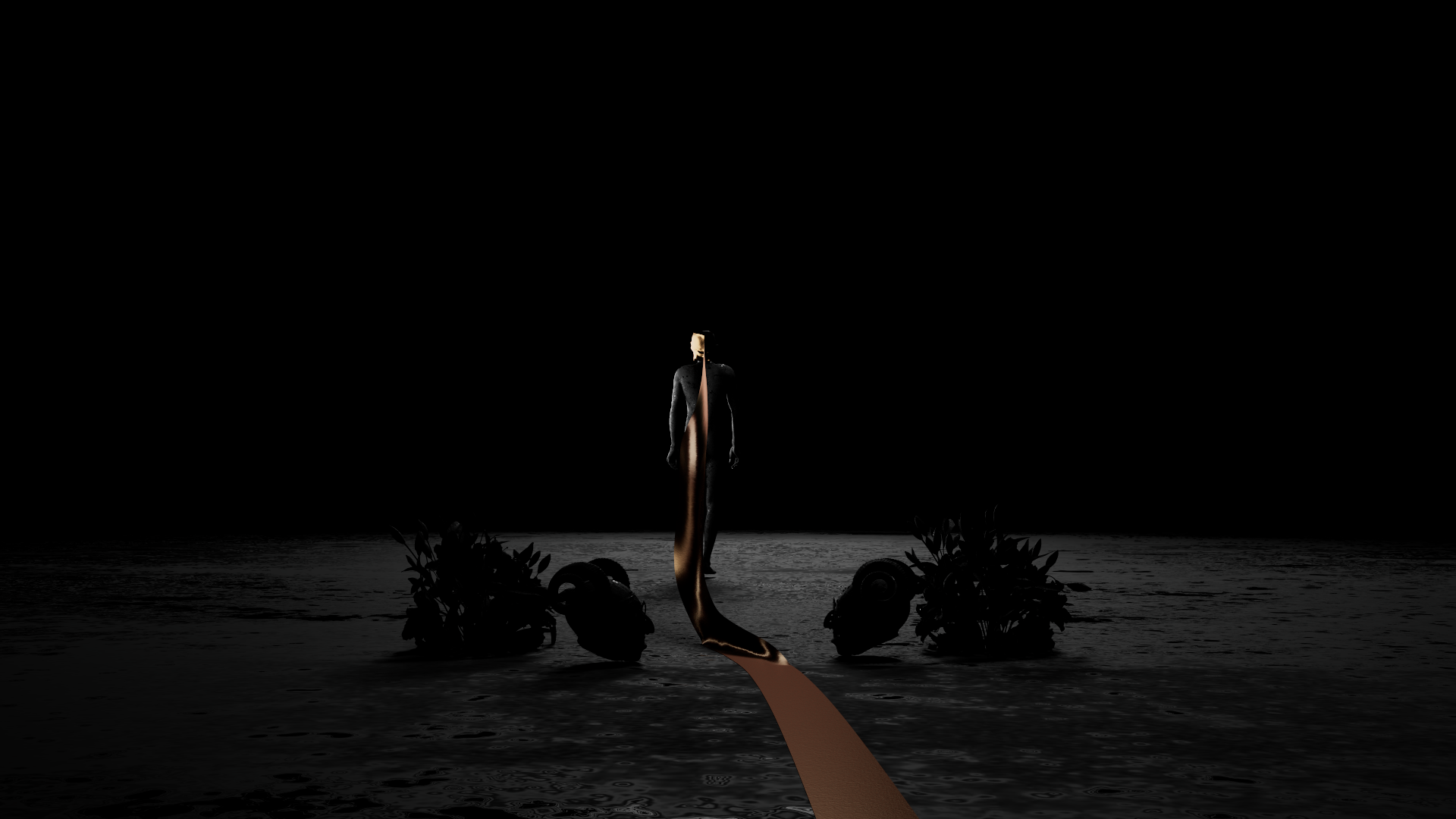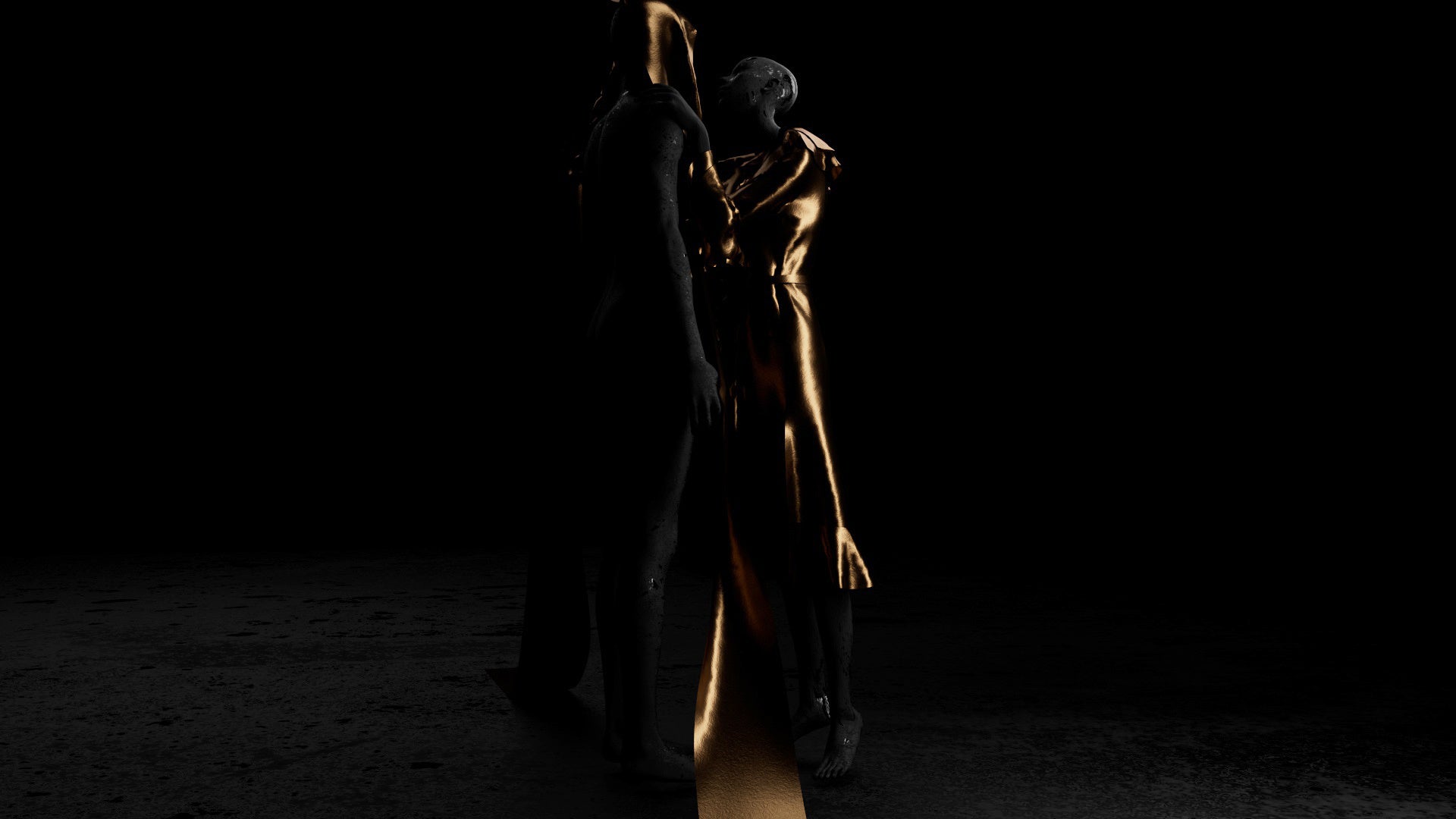 ギリシャ神話に登場する”ヘルマプロディートス”の彫刻から着想したテーマ「ドレスの迷宮」。ドレスのパターンが1体になる描写を重ね、生と死、男と女、過去と未来の対比と融合を描く。