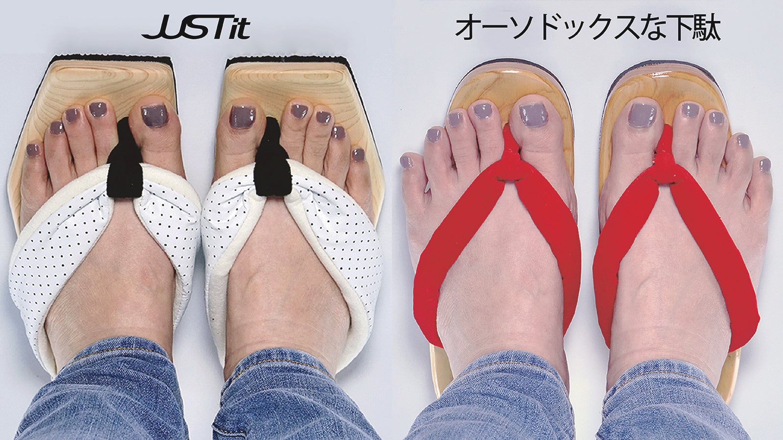 伝統的な下駄と現代のデザインが融合し考え出されたのが、JUSTit-ジャスティット-の足がはみださない新形状です。