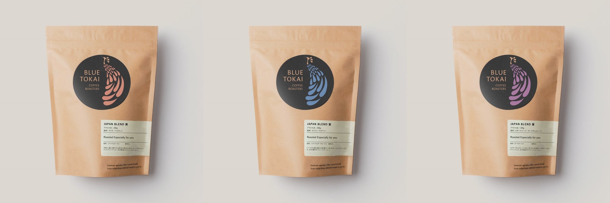JAPAN BLENDは、個性豊かなインド産コーヒーのみを使用しており、中煎り、中深煎り、深煎りの焙煎度ごとに、それぞれ「茜(あかね)」「藍(あい)」「菫(すみれ)」という3種類のブレンドを提供します。