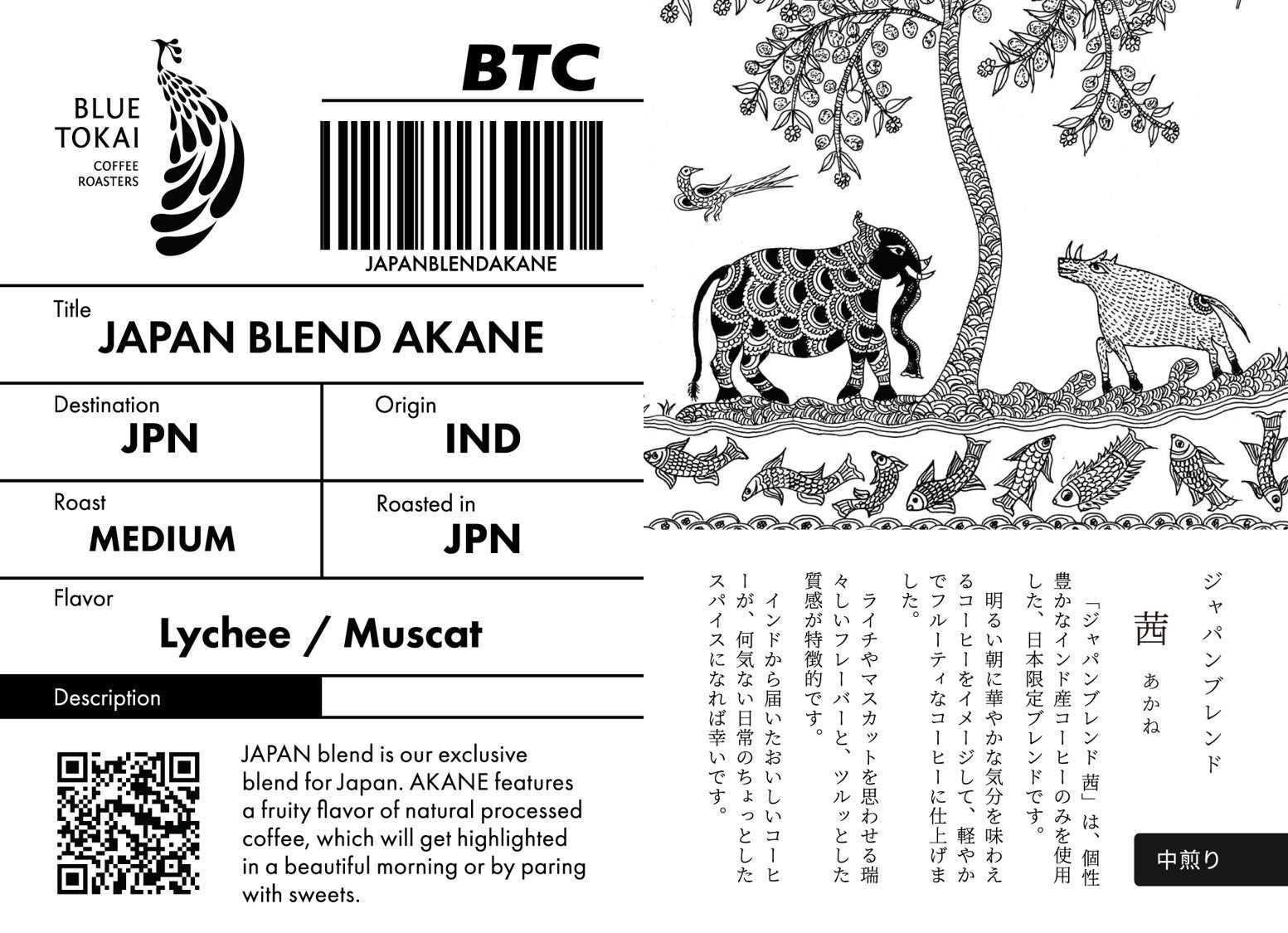 同封されるコーヒーカードには、インドの伝統技法を用いたアート作品が描かれ、焙煎度順に3枚並べると、動物や植物がのびのびと生きる大自然の中でコーヒーを生産している、インドの生産地を思わせる絵になります。