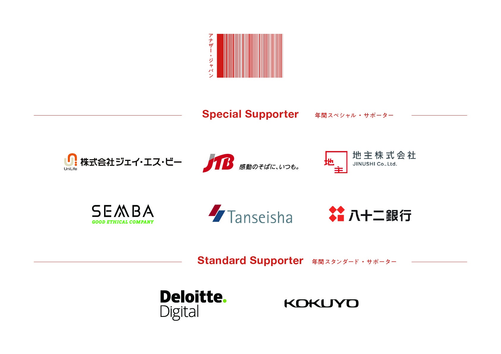 - 特典: ‐ 店舗内へ企業名・ロゴの掲示 ‐ Webサイト、イベント、活動報告書における企業名・ロゴの掲示、紹介 ‐ アナザー・ジャパンとのコラボレーション企画の実施