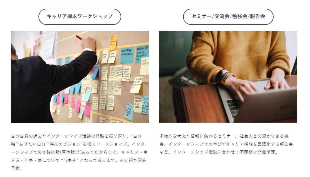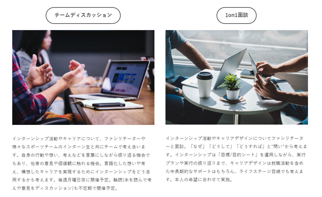 様々なスポーツチームでインターンシップを行う学生がオンラインで集まり、各チームでのインターンシップでの「実践経験」をベースに、「エンビジョン(構想する)」「リフレクション(振り返る)」「インプット(取り入れる)」といった機会を連動させることで、実践的なインターンシップの活動機会を「経験」で留まらせず、キャリアデザインに繋げ、 「ありたい自分の探求・実現」に向けたサポートを行います。