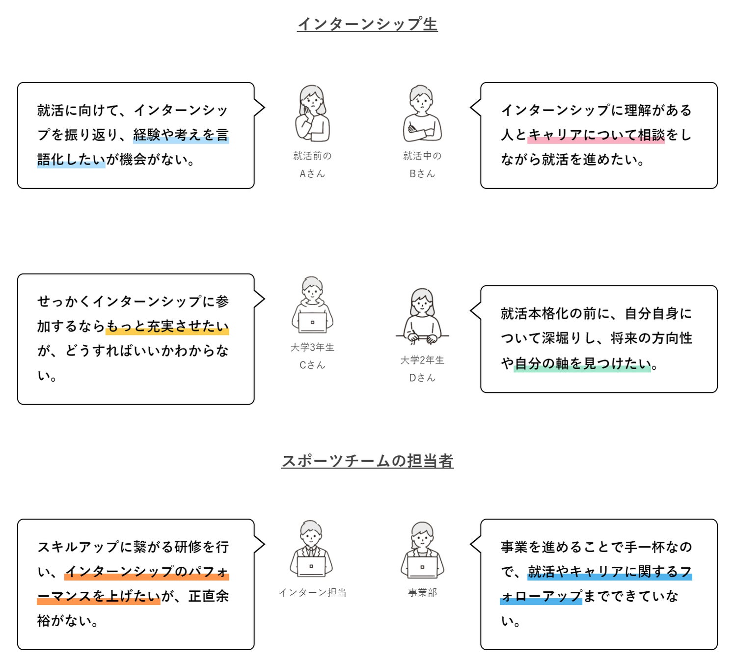 企画・運営を行うファシリテーターが、スポーツチームでの実践型インターンシップによる人材育成を約6年、400名以上の学生を担当した経験から、スポーツチームの長期インターンシップの機会をさらなるキャリア開発の機会に繋げていきたいと感じ、スポーツチームのインターンシップに特化したプログラムを考案。