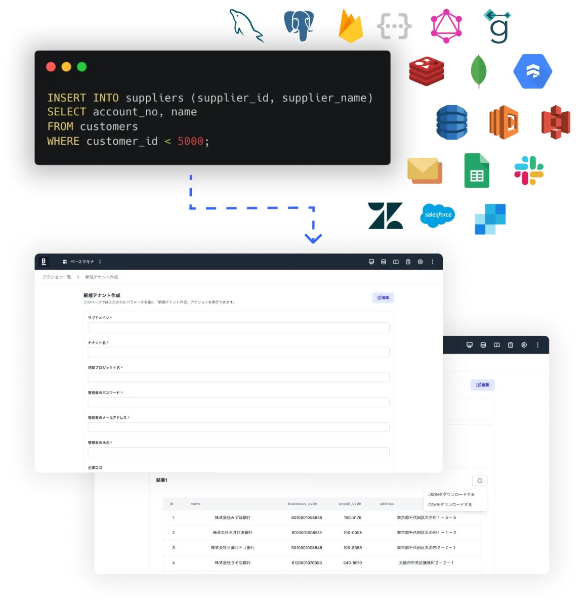 『BaseMachina(ベースマキナ)』は自社のデータベースやAPI、外部サービスを呼び出す処理を登録するだけで、社内向け管理画面など用途に使えるUIを自動で生成するローコードのサービスです。