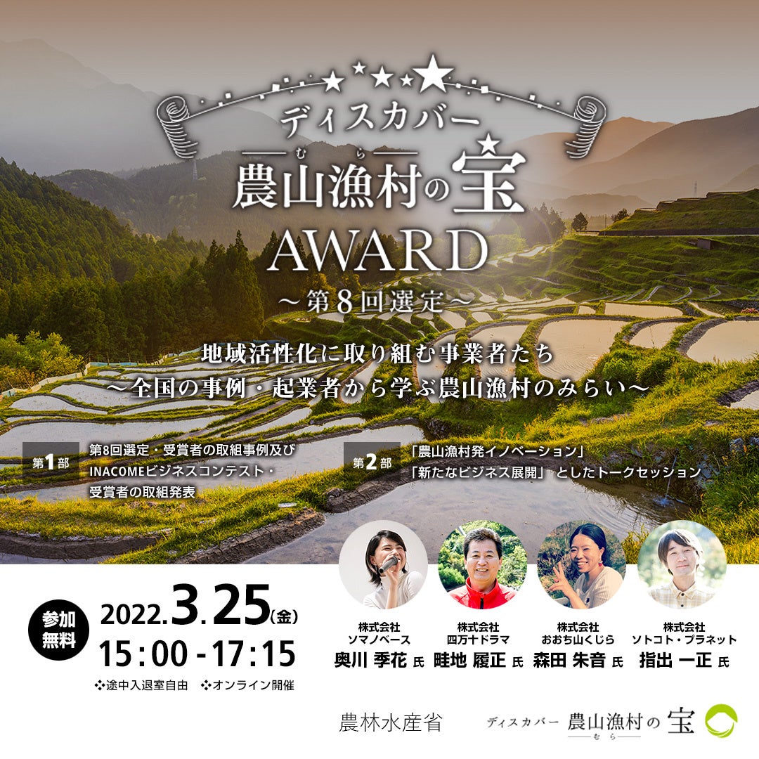 第一部では、選定者(受賞者等)とINACOMEビジネスコンテスト最優秀受賞者等からの事例発表、第二部では、新しい切り口で農山漁村を盛り上げている事業者とファシリテーターによるトークセッションを行い、持続可能な農山漁村の姿を探っていくセミナーをオンラインで開催します。