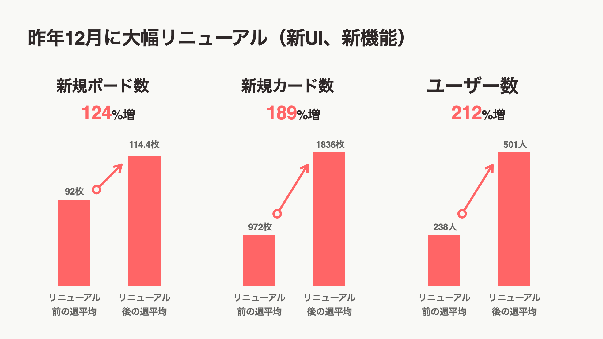 カード型コミュニケーションツール「postalk」は2021年12月6日にUIデザインを刷新し、ボード間の関係性をより効果的にするためにネットワーク構造を導入するアップデートを行いました。そして本アップデートを通じて週あたりの新規ユーザー数が212%増加し、またユーザーの作成するボード数も124%増加したことがわかりました。これはユーザー数の増加だけでなく、ユーザーのみなさまが継続的にpostalkを使ってくださっていることを表し、postalkがリモートワーク時代の知的生産を支えるサービスへと定着したことを示しています。