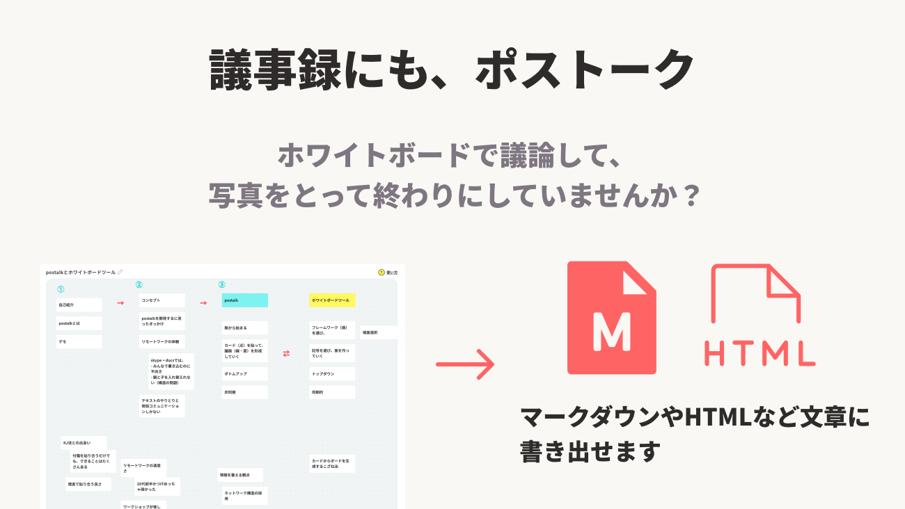 postalkは貼られたカードをテキスト・マークダウン・HTMLへと変換することができます。話し合った内容をそのままメールやチャットで送ることができますし、Notionであれば、そのままボードを埋め込むことも可能です。( 詳細:https://the.postalk.app/b/UA1C1ZvRpYUgOYKHsdlS )