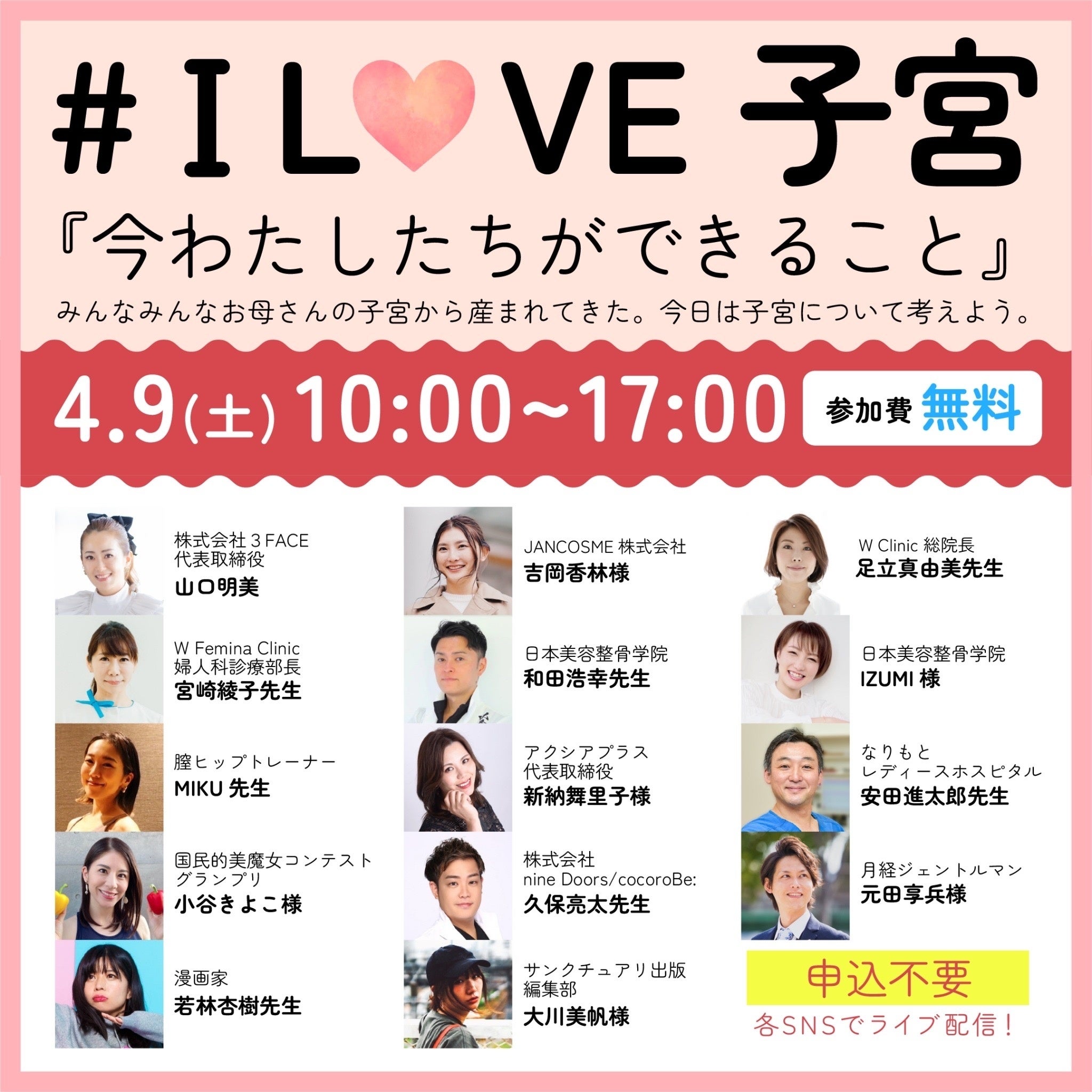 トータルフェムケア(腟ケア・腟トレ)の正しい知識の普及に努める株式会社3FACEが2022年4月9日(土)、子宮(49)の日にちなんで 子宮といのちについて考えるイベント『#ILOVE子宮「今わたしたちにできること」〜みんなみんなお母さんの子宮から産まれてきた。今日は子宮について考えよう〜』を開催します。