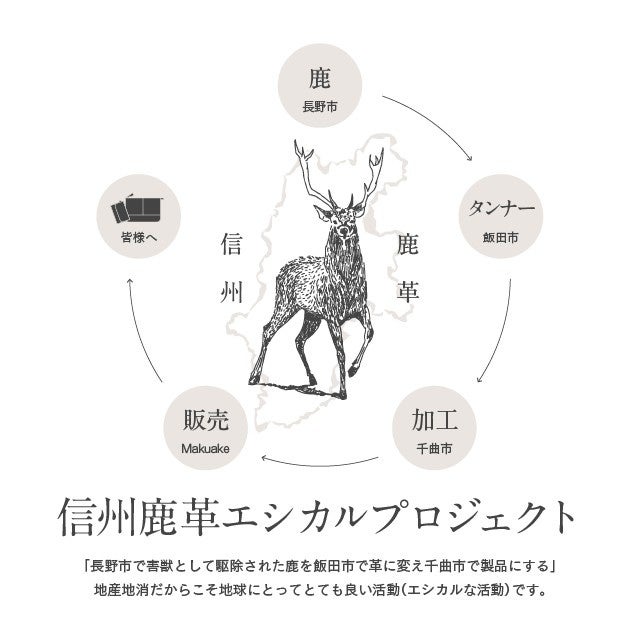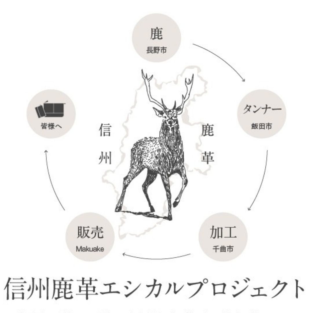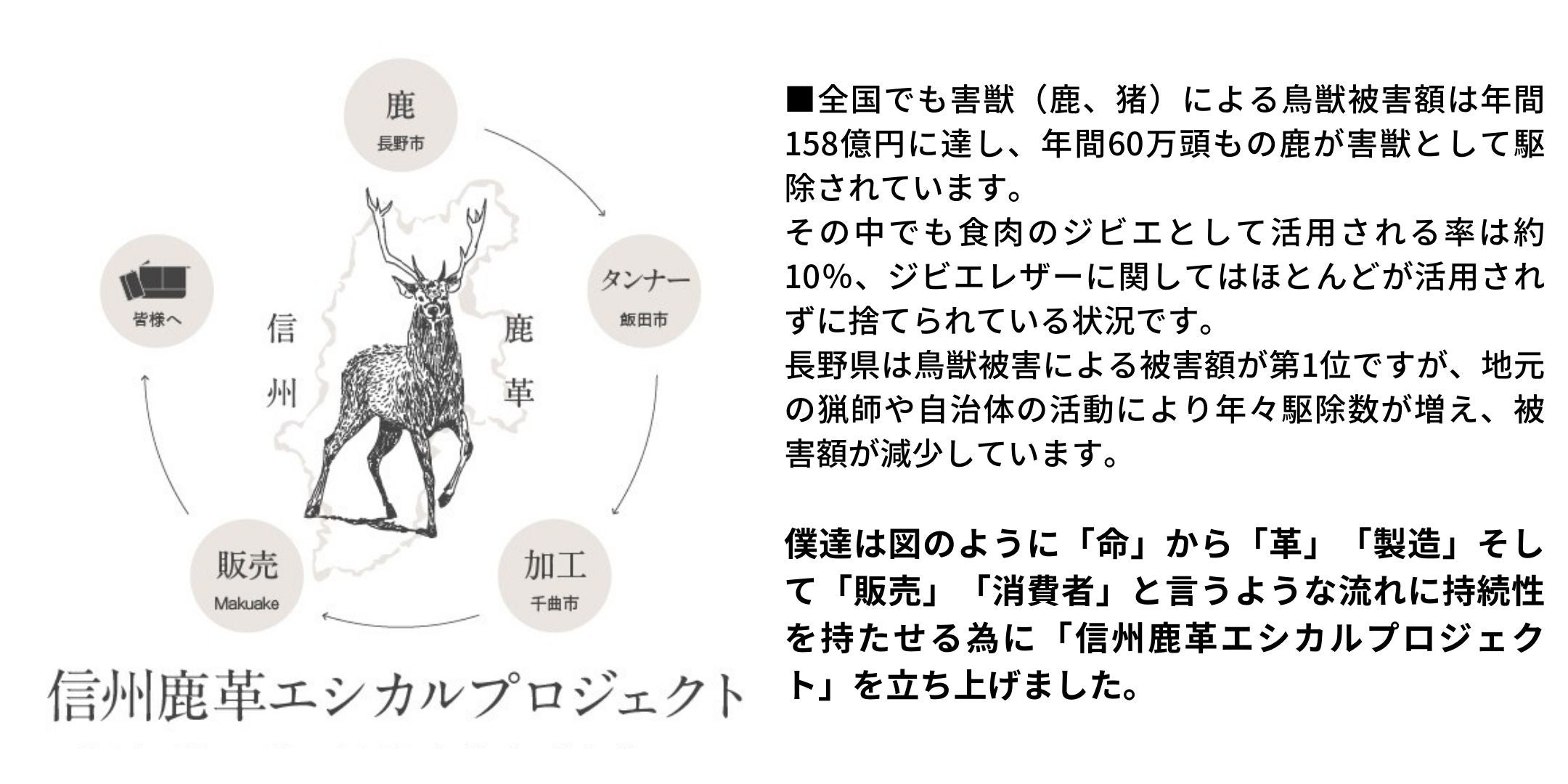 僕達は図のように「命」から「革」「製造」そして「販売」「消費者」と言うような流れに持続性を持たせる為に「信州鹿革エシカルプロジェクト」を立ち上げました。