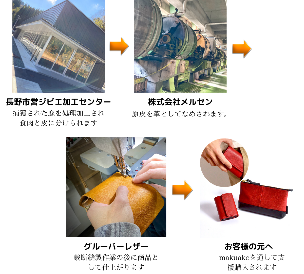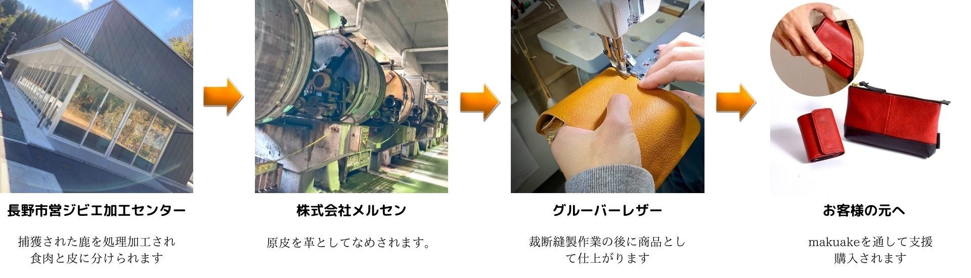 長野市で捕獲された鹿は「長野市営ジビエ加工センター」により処理加工されて食肉と、皮などに分かれます。皮として分かれた原皮を飯田市の「株式会社メルセン」に運び入れ、革としてなめされます。その後千曲市のグルーバーレザーにより商品と変わりお客様の元に送られます。