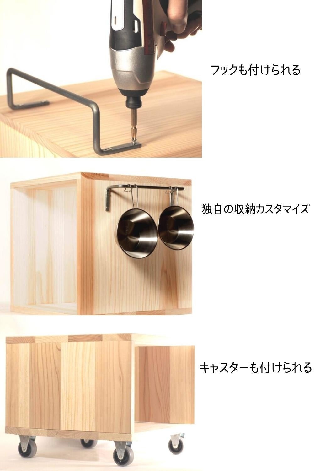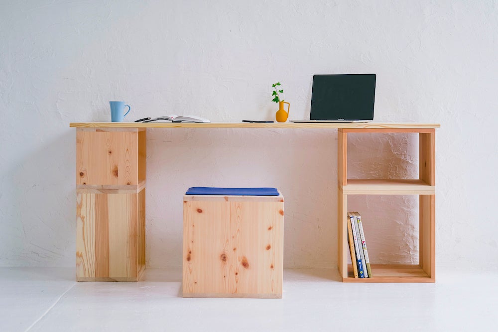 組合わせた高さは、勉強机、食卓、カウンターテーブルなどに適した寸法になるよう設計しました。また、無垢の木材だからご自身好みに色を塗ったり、キャスターやフックを付けてることも可能です。(※フックやキャスターは付属しておりません。)