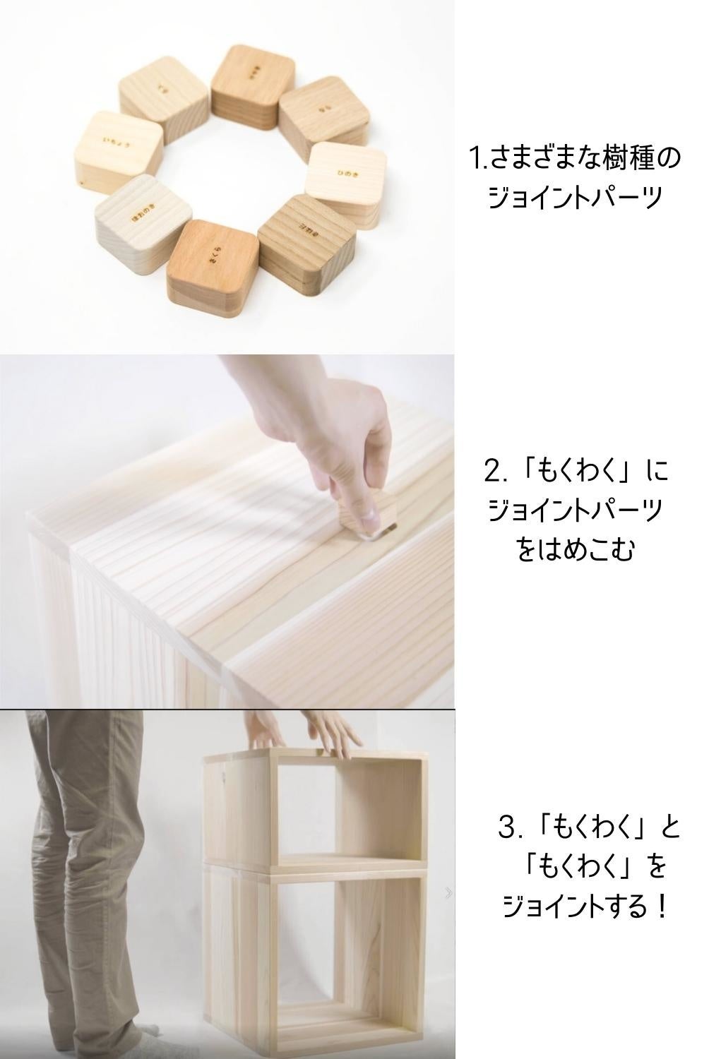”もくわく®”は、シンプルな木の枠とジョイントパーツの小さな木片からなる国産木材の家具です。暮らし方に合わせて、収納の形を自由につくることができます。また、天板と金具を組合わせれば、テーブルやデスクにもなります。「木を使って自分の空間を簡単にカスタマイズできる」それが、もくわくの最大の特徴です。
