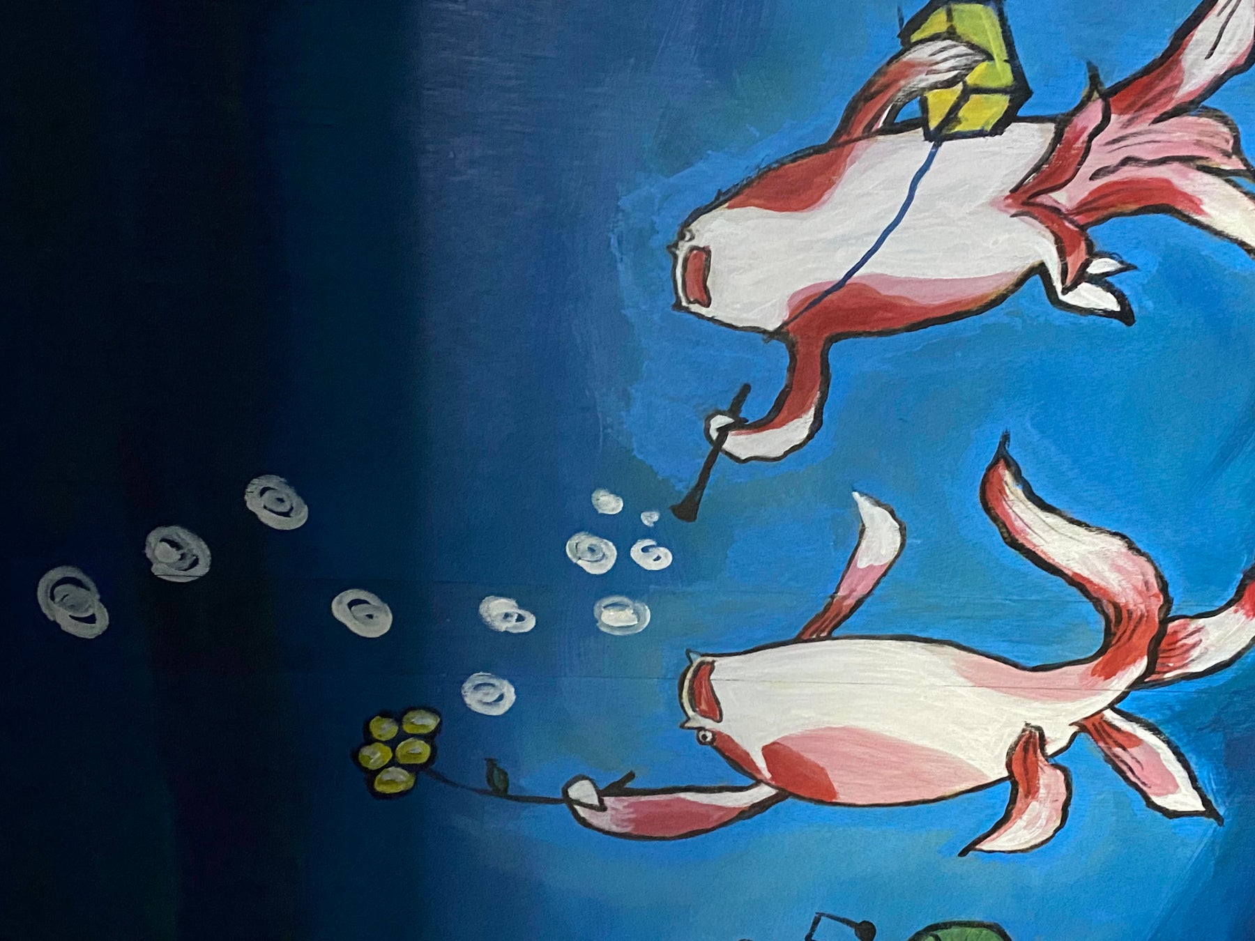 西成ベースの作家Jasmine erikoは「笑いが止まらないほど不器用な自分の生き方を肯定し、直感に賭けて突き進む日常に楽しさが生まれる」ことを感じながら、本作品を制作しました。