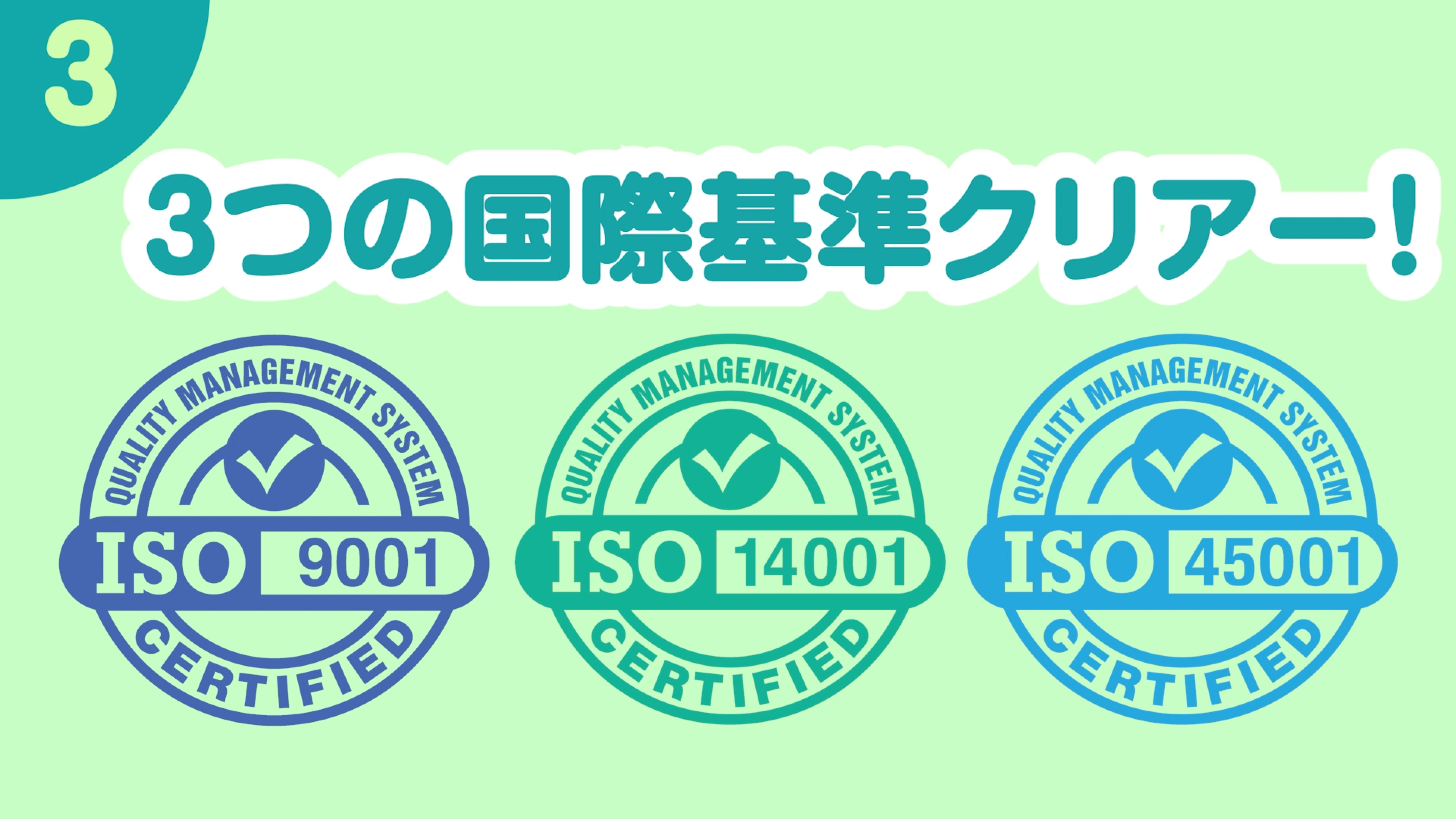 本商品の製造工場は、ISO9001(徹底した品質管理)・ISO14001(地球環境へ配慮した組織/企業活動を行っている)・ISO45001(あらゆる職場において、安全な労働環境を整える)の、3つの国際基準をクリアーした工場で徹底した厳しい品質管理の元で製造されております。