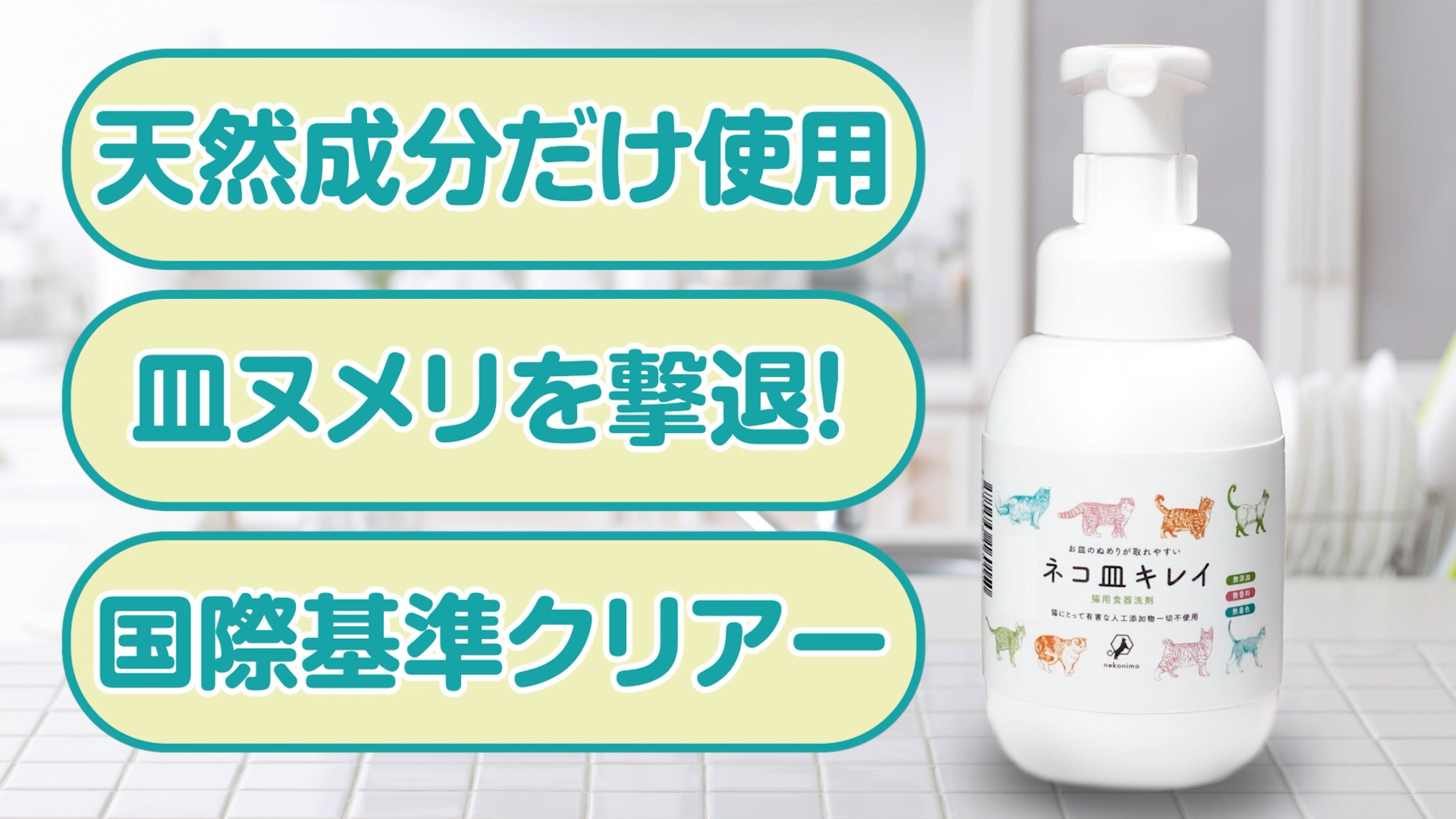 本洗剤は、猫に有害とされる「精油・香料・PG・着色料・石油-硫黄系界面活性剤、リン、エタノール、パラベン」、「ペットフード安全法に該当する規制成分」を一切不使用の猫ちゃんの安全に最大限配慮した食器用洗剤です。
