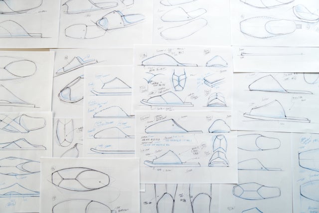 いざスリッパをつくろうと思い立っても、その道のりは簡単なものではありませんでした。まずはとにかく既存のスリッパを分解して、構造を理解するところから始めました。そしてたくさんのアイデアスケッチの中から試作検証を繰り返し、理想の機能・形状を追求しました。