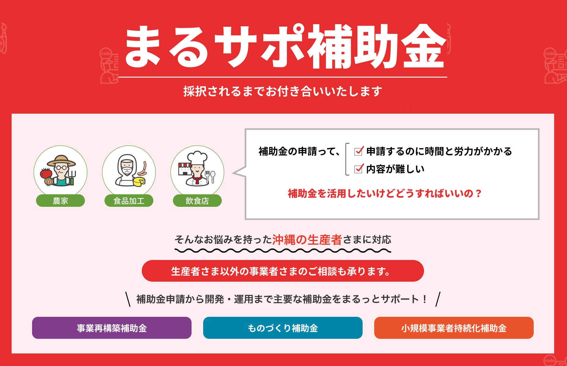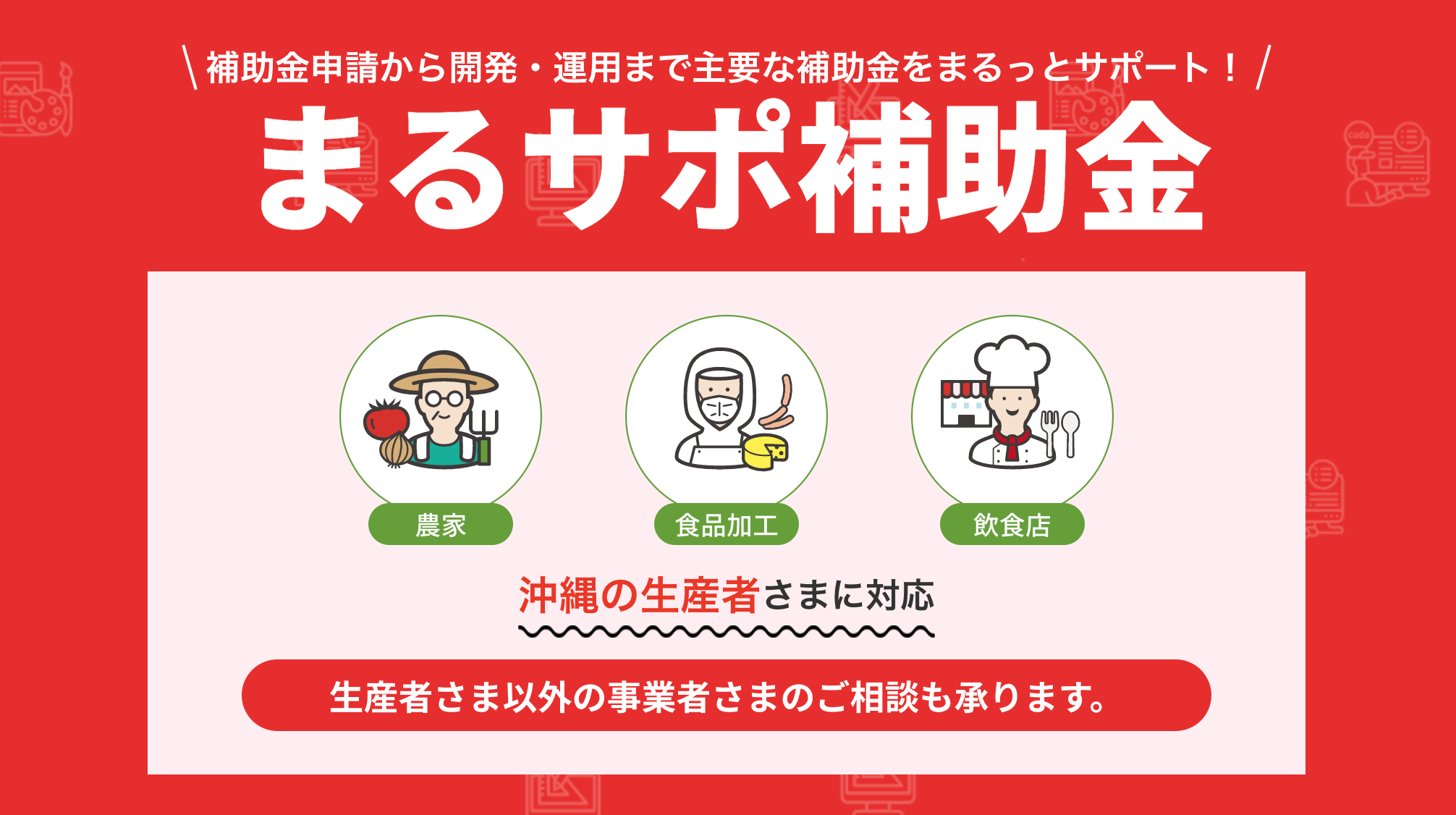 【まるサポ補助金】で主要な補助金の申請から開発・運用まで「まるっと」サポート!沖縄の生産者を中心とした事業者を対象に、補助金を活用した事業構想の実現をすべてワンストップで対応します。