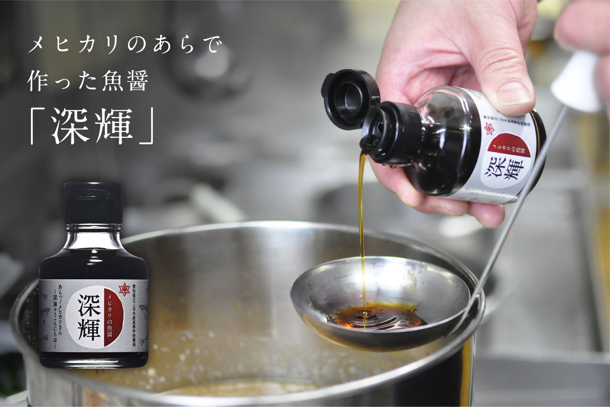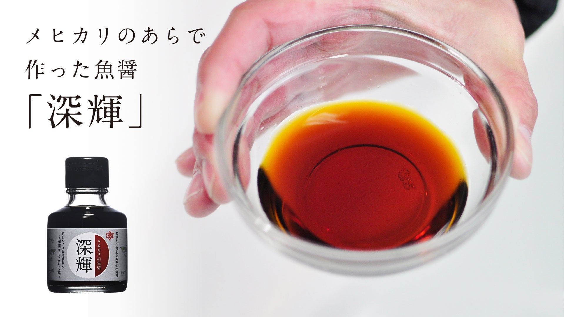 メヒカリは正式和名「アオメエソ」といい、深海に住む大きさ20センチほどの魚です。その特徴は大きな緑色の目で、光が当たると発光して見えるのが通称メヒカリ(目光)の名前の由来です。愛知県蒲郡市は日本有数のメヒカリの水揚げ地で、メヒカリは地元ではよく食べられる定番の魚です。しかし、唐揚げなどに加工する際、頭を含めた「あら」は大量に廃棄されてしまう問題がありました。この「メヒカリ」の「あら」を捨てずに有効活用して作られたのが、魚醤「深輝」。愛知県立三谷水産高等学校の生徒を中心に、地元企業が共同開発した魚醤です。