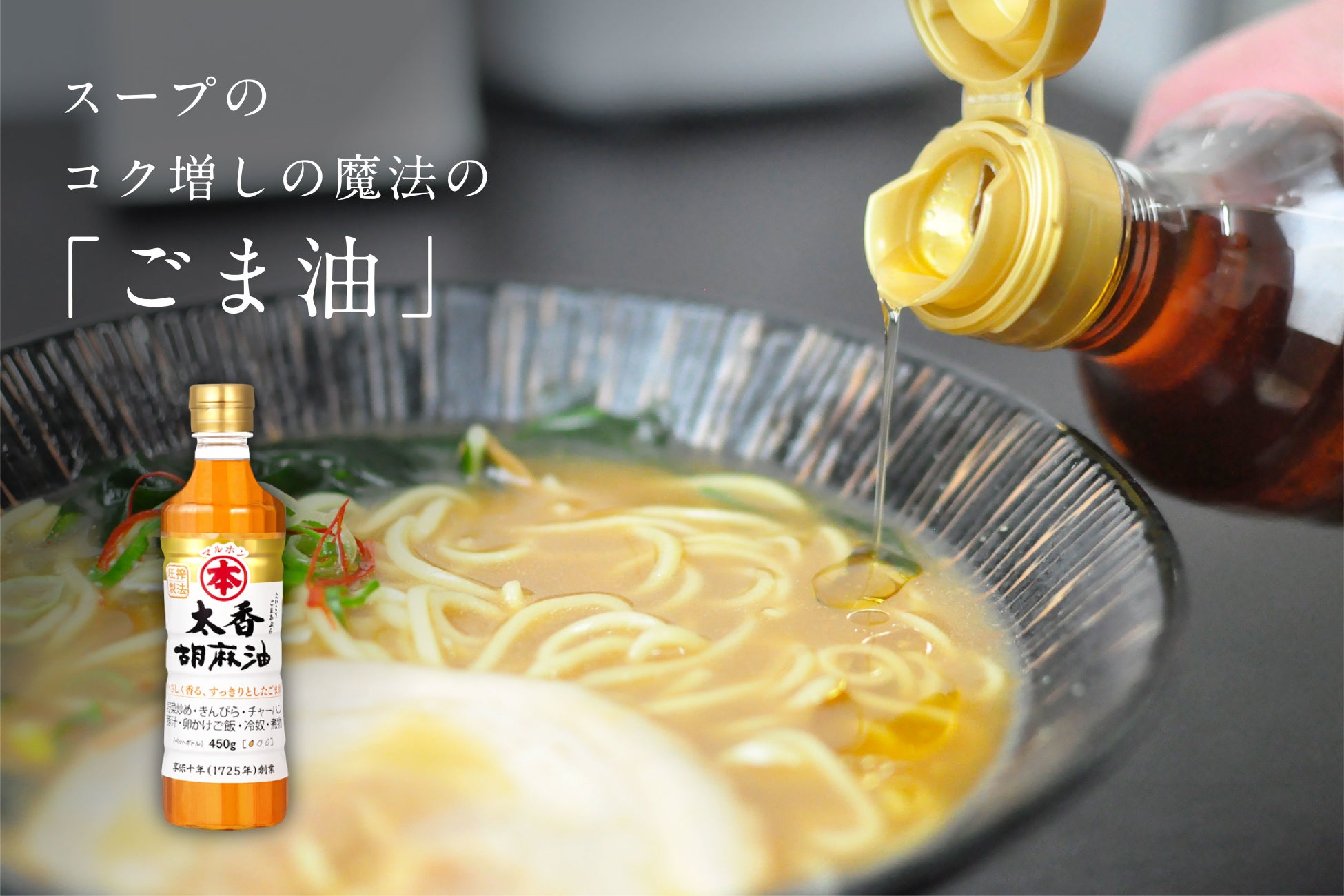 さらに美味しさを引き立たせる追加調味料の胡麻油は、蒲郡名産の竹本油脂(株)製「太香胡麻油」。雑味をマスキングして味噌魚醤スープの旨味を引き出します。