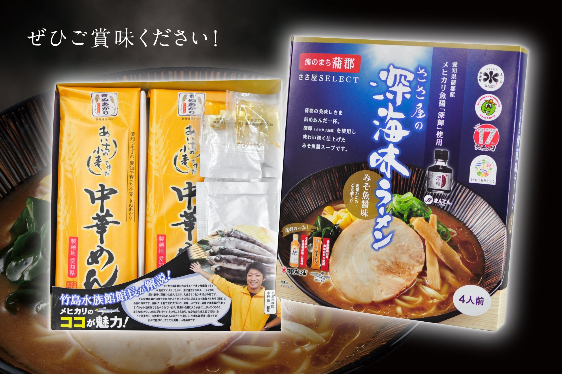 ラーメン屋「海魅浪漫 ささ屋」では、蒲郡の深海魚「メヒカリ」を使ったラーメン「深海味ラーメン」を、塩味、醤油味、味噌味の3種類で提供しています。独特の魚醤風味と毎日でも食べられるような優しい味わいが特徴で、お子様からお年寄りまで幅広い年齢層にお召し上がりいただき、2021年の店舗オープンから1年間で14,000食以上を販売しました。 この度、この美味しさを全国の皆様にも味わっていただきたいとお土産用ギフトセットを開発しました。