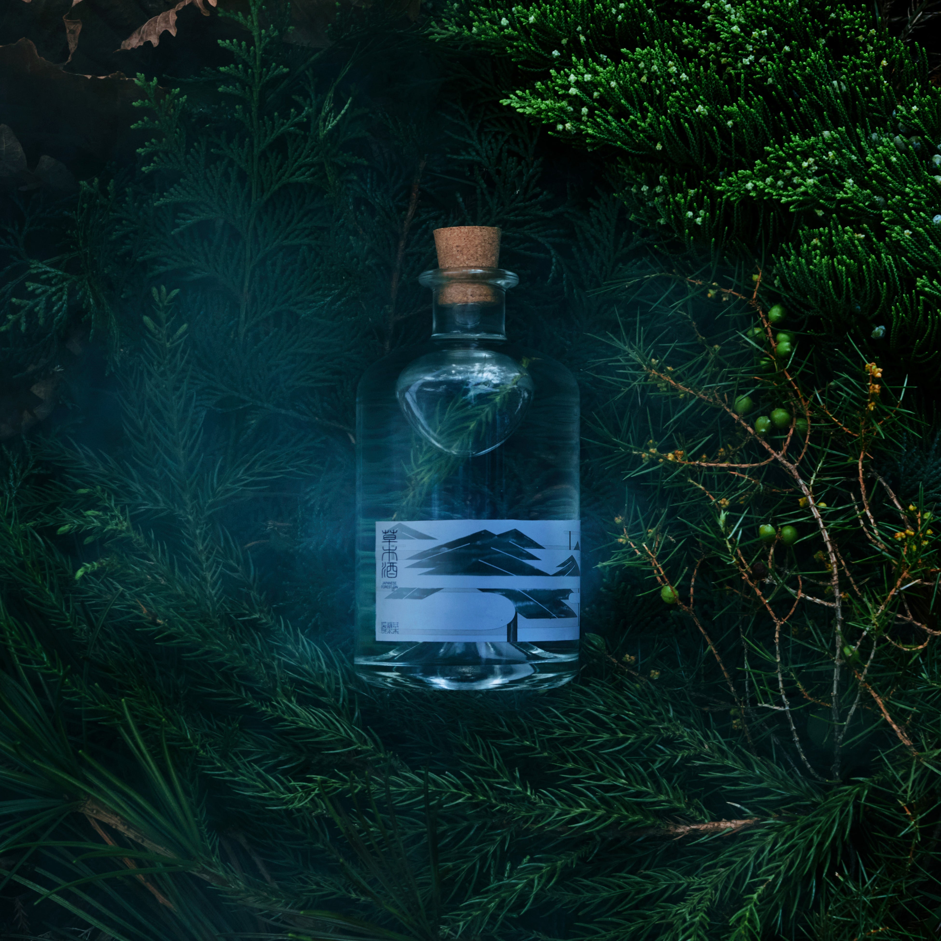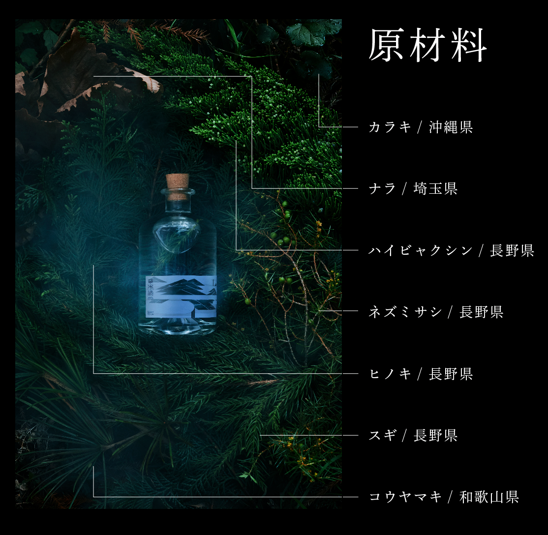 まるで深い新緑の森の中で深呼吸した時のような圧倒的な「森林感」を味わえるフォレストジン。ヒノキの枝葉から抽出する鼻を抜ける青いフレッシュな香りや、杉の林檎を思わせるたおやかな芳香、そして神事でも利用される高野山の霊木コウヤマキの酸味ある後味。ハイビャクシンとネズミサシは和製ジュニパーベリーとして機能し、スパイシーで華やかな風味が引き立つ。